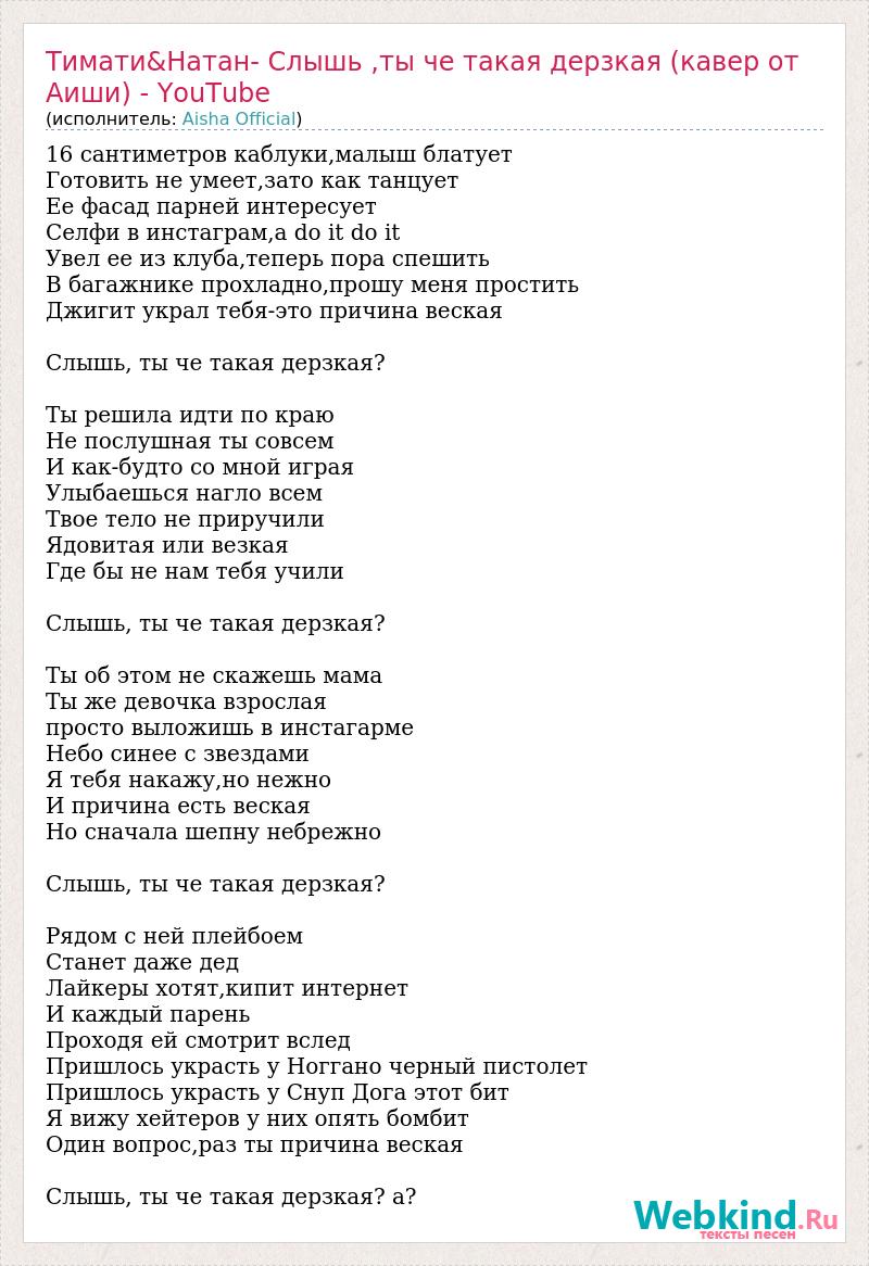 Главная→Исполнители→Aisha Official→Тимати&Натан- Слышь ,ты че такая дерзкая (кавер от Аиши) - YouTube