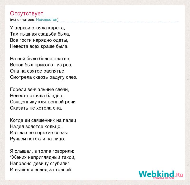 У церкви стояла карета, Там пышная свадьба была, Все гости нарядно одеты, Невеста всех краше была. На ней было белое платье, Венок был приколот из роз, Она на святое распятье Смотрела сквозь радугу слез. Горели венчальные свечи, Невеста стояла бледна, Священнику клятвенной речи Сказать не хотела она. Когда ей священник на палец Надел золотое кольцо, Из глаз ее горькие слезы Ручьем потекли на лицо. Я слышал, в толпе говорили: "Жених неприглядный такой, Напрасно девицу сгубили". И вышел я вслед за толпой.