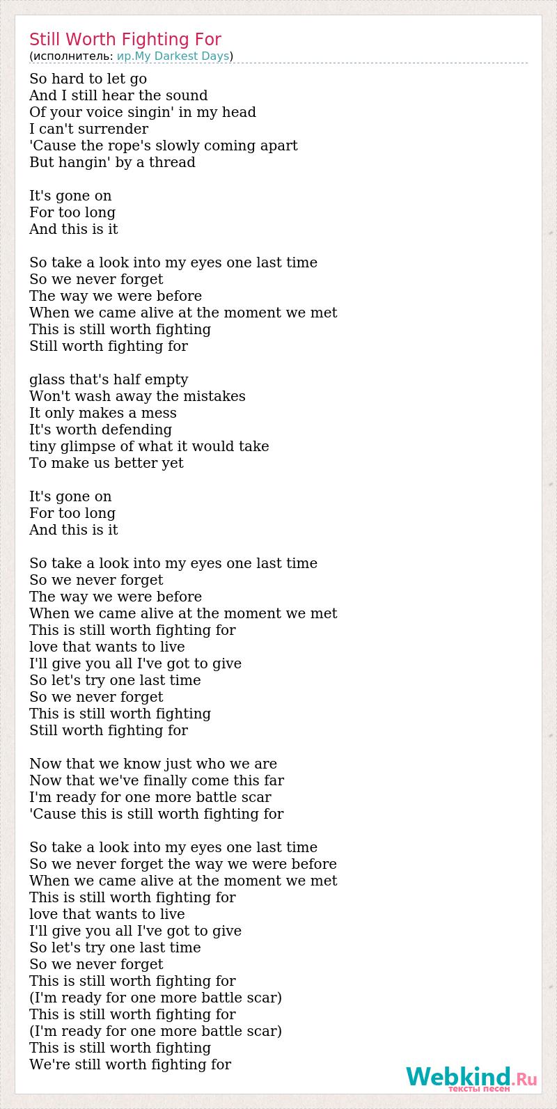So hard to let go And I still hear the sound Of your voice singin' in my head I can't surrender 'Cause the rope's slowly coming apart But hangin' by a thread It's gone on For too long And this is it So take a look into my eyes one last time So we never forget The way we were before When we came alive at the moment we met This is still worth fighting Still worth fighting for glass that's half empty Won't wash away the mistakes It only makes a mess It's worth defending tiny glimpse of what it would take To make us better yet It's gone on For too long And this is it So take a look into my eyes one last time So we never forget The way we were before When we came alive at the moment we met This is still worth fighting for love that wants to live I'll give you all I've got to give So let's try one last time So we never forget This is still worth fighting Still worth fighting for Now that we know just who we are Now that we've finally come this far I'm ready for one more battle scar 'Cause this is still worth fighting for So take a look into my eyes one last time So we never forget the way we were before When we came alive at the moment we met This is still worth fighting for love that wants to live I'll give you all I've got to give So let's try one last time So we never forget This is still worth fighting for (I'm ready for one more battle scar) This is still worth fighting for (I'm ready for one more battle scar) This is still worth fighting We're still worth fighting for
