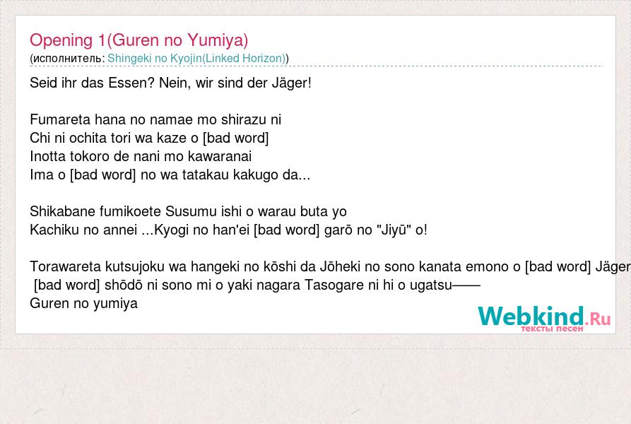 Seid ihr das Essen? Nein, wir sind der Jäger! Fumareta hana no namae mo shirazu ni Chi ni ochita tori wa kaze o [bad word] Inotta tokoro de nani mo kawaranai Ima o [bad word] no wa tatakau kakugo da... Shikabane fumikoete Susumu ishi o warau buta yo Kachiku no annei ...Kyogi no han'ei [bad word] garō no "Jiyū" o! Torawareta kutsujoku wa hangeki no kōshi da Jōheki no sono kanata emono o [bad word] Jäger [bad word] shōdō ni sono mi o yaki nagara Tasogare ni hi o ugatsu—— Guren no yumiya