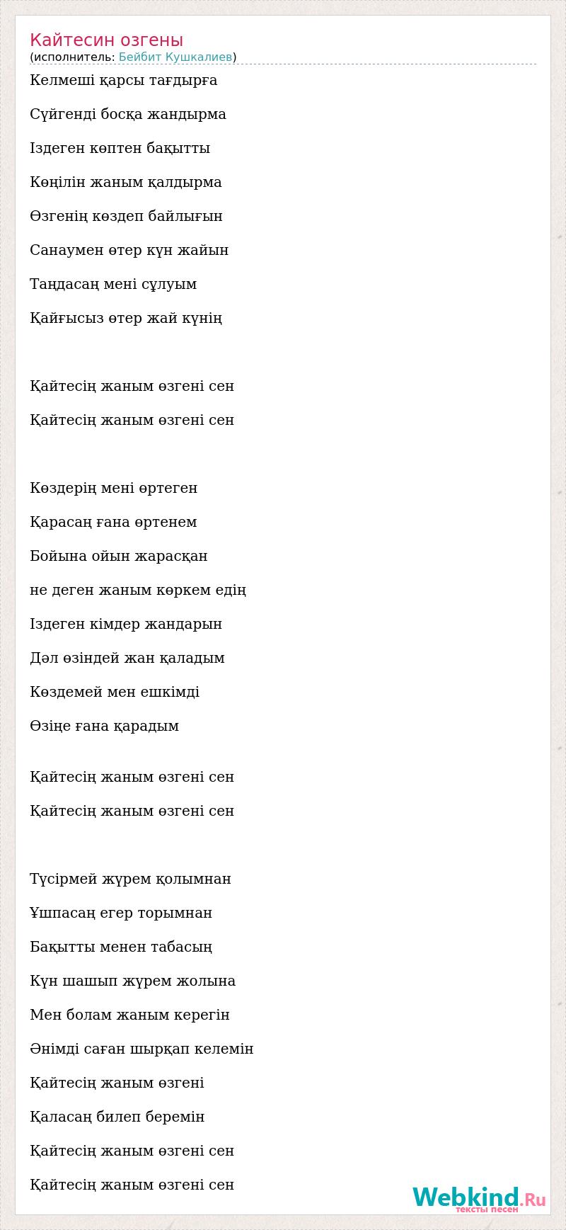 Келмеші қарсы тағдырға Сүйгенді босқа жандырма Іздеген көптен бақытты Көңілін жаным қалдырма Өзгенің көздеп байлығын Санаумен өтер күн жайын Таңдасаң мені сұлуым Қайғысыз өтер жай күнің Қайтесің жаным өзгені сен Қайтесің жаным өзгені сен Көздерің мені өртеген Қарасаң ғана өртенем Бойына ойын жарасқан не деген жаным көркем едің Іздеген кімдер жандарын Дәл өзіндей жан қаладым Көздемей мен ешкімді Өзіңе ғана қарадым Қайтесің жаным өзгені сен Қайтесің жаным өзгені сен Түсірмей жүрем қолымнан Ұшпасаң егер торымнан Бақытты менен табасың Күн шашып жүрем жолына Мен болам жаным керегін Әнімді саған шырқап келемін Қайтесің жаным өзгені Қаласаң билеп беремін Қайтесің жаным өзгені сен Қайтесің жаным өзгені сен
