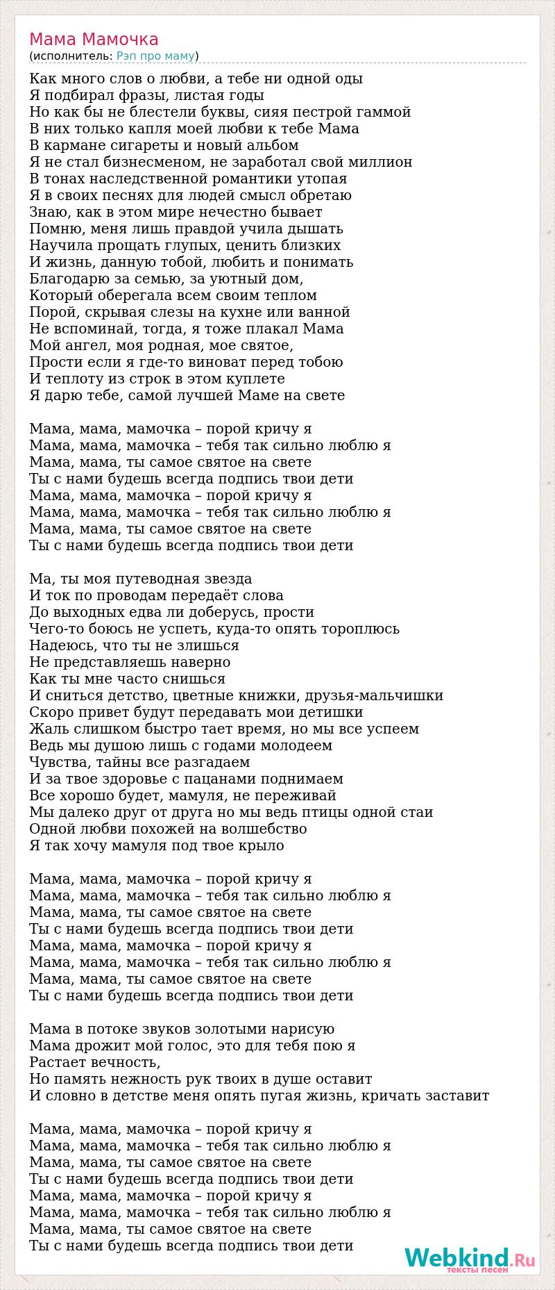 Как много слов о любви, а тебе ни одной оды Я подбирал фразы, листая годы Но как бы не блестели буквы, сияя пестрой гаммой В них только капля моей любви к тебе Мама В кармане сигареты и новый альбом Я не стал бизнесменом, не заработал свой миллион В тонах наследственной романтики утопая Я в своих песнях для людей смысл обретаю Знаю, как в этом мире нечестно бывает Помню, меня лишь правдой учила дышать Научила прощать глупых, ценить близких И жизнь, данную тобой, любить и понимать Благодарю за семью, за уютный дом, Который оберегала всем своим теплом Порой, скрывая слезы на кухне или ванной Не вспоминай, тогда, я тоже плакал Мама Мой ангел, моя родная, мое святое, Прости если я где-то виноват перед тобою И теплоту из строк в этом куплете Я дарю тебе, самой лучшей Маме на свете Мама, мама, мамочка – порой кричу я Мама, мама, мамочка – тебя так сильно люблю я Мама, мама, ты самое святое на свете Ты с нами будешь всегда подпись твои дети Мама, мама, мамочка – порой кричу я Мама, мама, мамочка – тебя так сильно люблю я Мама, мама, ты самое святое на свете Ты с нами будешь всегда подпись твои дети Ма, ты моя путеводная звезда И ток по проводам передаёт слова До выходных едва ли доберусь, прости Чего-то боюсь не успеть, куда-то опять тороплюсь Надеюсь, что ты не злишься Не представляешь наверно Как ты мне часто снишься И сниться детство, цветные книжки, друзья-мальчишки Скоро привет будут передавать мои детишки Жаль слишком быстро тает время, но мы все успеем Ведь мы душою лишь с годами молодеем Чувства, тайны все разгадаем И за твое здоровье с пацанами поднимаем Все хорошо будет, мамуля, не переживай Мы далеко друг от друга но мы ведь птицы одной стаи Одной любви похожей на волшебство Я так хочу мамуля под твое крыло Мама, мама, мамочка – порой кричу я Мама, мама, мамочка – тебя так сильно люблю я Мама, мама, ты самое святое на свете Ты с нами будешь всегда подпись твои дети Мама, мама, мамочка – порой кричу я Мама, мама, мамочка – тебя так сильно люблю я Мама, мама, ты самое святое на свете Ты с нами будешь всегда подпись твои дети Мама в потоке звуков золотыми нарисую Мама дрожит мой голос, это для тебя пою я Растает вечность, Но память нежность рук твоих в душе оставит И словно в детстве меня опять пугая жизнь, кричать заставит Мама, мама, мамочка – порой кричу я Мама, мама, мамочка – тебя так сильно люблю я Мама, мама, ты самое святое на свете Ты с нами будешь всегда подпись твои дети Мама, мама, мамочка – порой кричу я Мама, мама, мамочка – тебя так сильно люблю я Мама, мама, ты самое святое на свете Ты с нами будешь всегда подпись твои дети