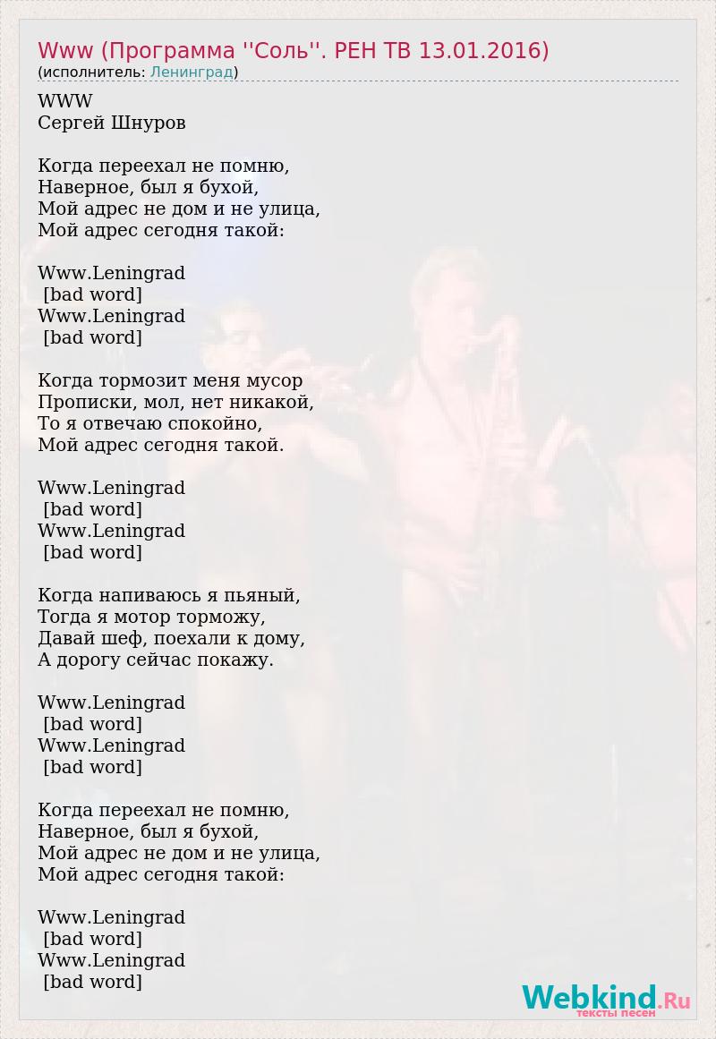 WWW Сергей Шнуров Когда переехал не помню, Наверное, был я бухой, Мой адрес не дом и не улица, Мой адрес сегодня такой: Www.Leningrad [bad word] Www.Leningrad [bad word] Когда тормозит меня мусор Прописки, мол, нет никакой, То я отвечаю спокойно, Мой адрес сегодня такой. Www.Leningrad [bad word] Www.Leningrad [bad word] Когда напиваюсь я пьяный, Тогда я мотор торможу, Давай шеф, поехали к дому, А дорогу сейчас покажу. Www.Leningrad [bad word] Www.Leningrad [bad word] Когда переехал не помню, Наверное, был я бухой, Мой адрес не дом и не улица, Мой адрес сегодня такой: Www.Leningrad [bad word] Www.Leningrad [bad word]