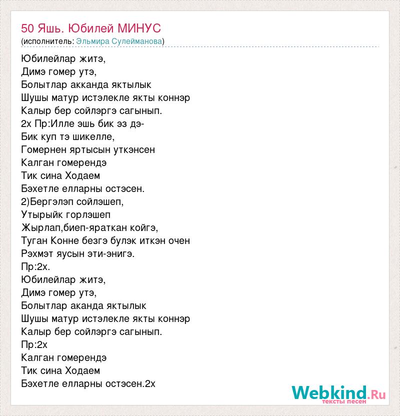 Юбилейлар житэ, Димэ гомер утэ, Болытлар акканда яктылык Шушы матур истэлекле якты коннэр Калыр бер сойлэргэ сагынып. 2х Пр:Илле эшь бик эз дэ- Бик куп тэ шикелле, Гомернен яртысын уткэнсен Калган гомерендэ Тик сина Ходаем Бэхетле елларны остэсен. 2)Бергэлэп сойлэшеп, Утырыйк горлэшеп Жырлап,биеп-яраткан койгэ, Туган Конне безгэ булэк иткэн очен Рэхмэт яусын эти-энигэ. Пр:2х. Юбилейлар житэ, Димэ гомер утэ, Болытлар аканда яктылык Шушы матур истэлекле якты коннэр Калыр бер сойлэргэ сагынып. Пр:2х Калган гомерендэ Тик сина Ходаем Бэхетле елларны остэсен.2х