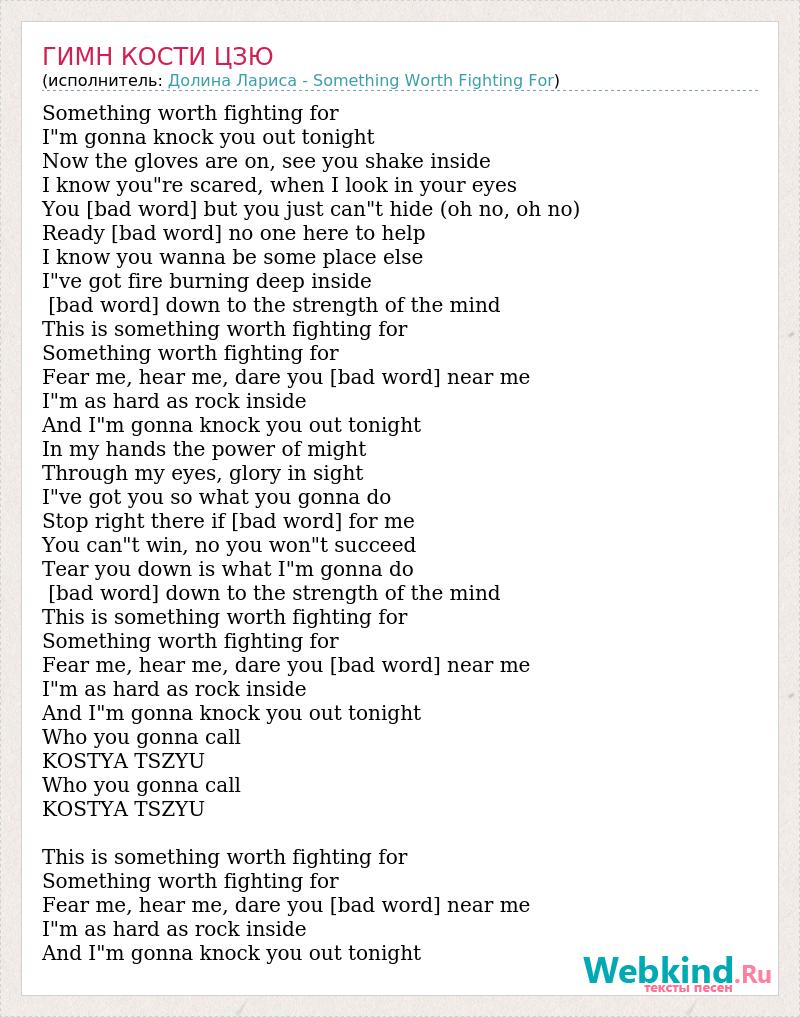 Something worth fighting for I"m gonna knock you out tonight Now the gloves are on, see you shake inside I know you"re scared, when I look in your eyes You [bad word] but you just can"t hide (oh no, oh no) Ready [bad word] no one here to help I know you wanna be some place else I"ve got fire burning deep inside [bad word] down to the strength of the mind This is something worth fighting for Something worth fighting for Fear me, hear me, dare you [bad word] near me I"m as hard as rock inside And I"m gonna knock you out tonight In my hands the power of might Through my eyes, glory in sight I"ve got you so what you gonna do Stop right there if [bad word] for me You can"t win, no you won"t succeed Tear you down is what I"m gonna do [bad word] down to the strength of the mind This is something worth fighting for Something worth fighting for Fear me, hear me, dare you [bad word] near me I"m as hard as rock inside And I"m gonna knock you out tonight Who you gonna call KOSTYA TSZYU Who you gonna call KOSTYA TSZYU This is something worth fighting for Something worth fighting for Fear me, hear me, dare you [bad word] near me I"m as hard as rock inside And I"m gonna knock you out tonight