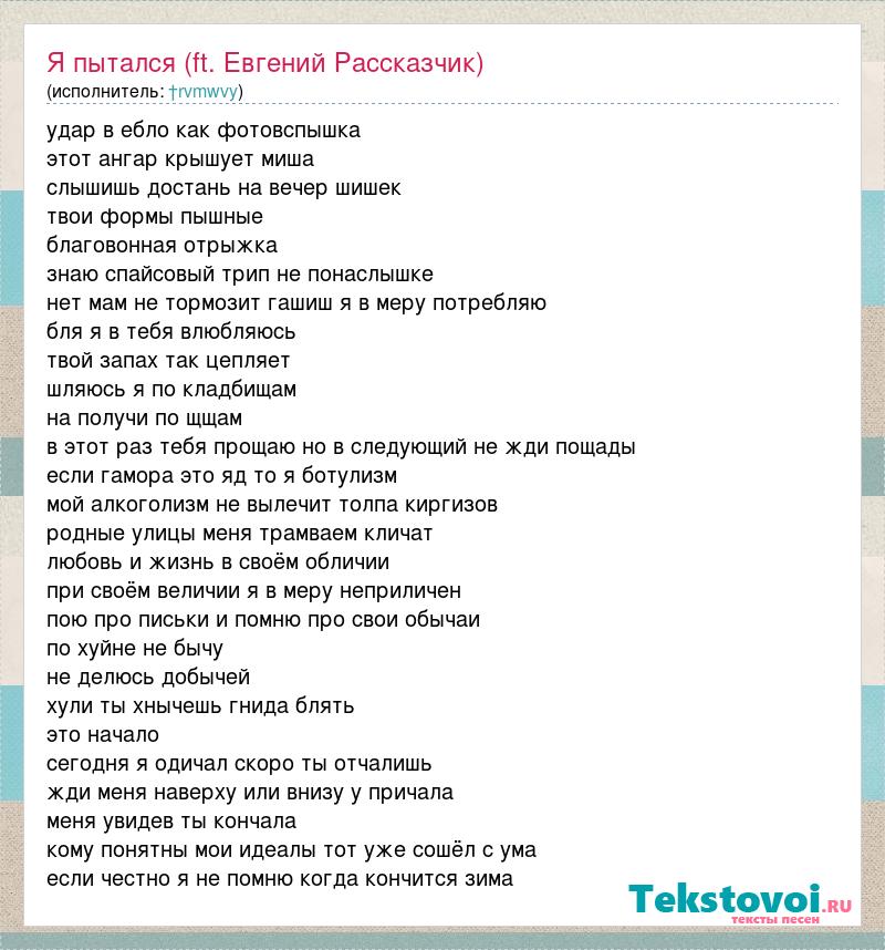 удар в ебло как фотовспышка этот ангар крышует миша слышишь достань на вечер шишек твои формы пышные благовонная отрыжка знаю спайсовый трип не понаслышке нет мам не тормозит гашиш я в меру потребляю бля я в тебя влюбляюсь твой запах так цепляет шляюсь я по кладбищам на получи по щщам в этот раз тебя прощаю но в следующий не жди пощады если гамора это яд то я ботулизм мой алкоголизм не вылечит толпа киргизов родные улицы меня трамваем кличат любовь и жизнь в своём обличии при своём величии я в меру неприличен пою про письки и помню про свои обычаи по хуйне не бычу не делюсь добычей хули ты хнычешь гнида блять это начало сегодня я одичал скоро ты отчалишь жди меня наверху или внизу у причала меня увидев ты кончала кому понятны мои идеалы тот уже сошёл с ума если честно я не помню когда кончится зима