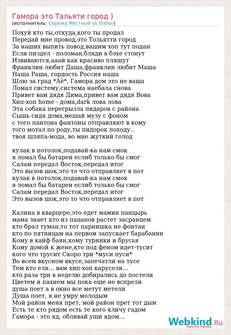 Похуй кто ты,откуда,кого ты продал Передай мне провод,это Тольятти город За наших выпить повод,вашим хоп тут подан Если пиздел - поломан,бляди в бэхе стонут Извиваются,ааай как красиво пляшут Франклин любит Даша,франклин любит Маша Наша Раша, гордость Россия наша Шлю за град *Аё*, Гамора дом это не ваша Ломал систему,система наебала снова Привет вам дядя Дима,привет вам дядя Вова Хип-хоп homе - дома,dark лова лова Эта собака перегрызла пидаров с района Сышь сидя дома,мешай музу с фоном с того пантона фантоны отправляют в кому того мотал по роду,ты пидорок походу.. твоя шляпа-мода, во мне жуткий голод кулак в потолок,подавай-ка нам смок я ломал бы батареи еслиб только бы смог Салам передал Восток,передал итог Это вызов шок,это то что отправляет в пот кулак в потолок,подавай-ка нам смок я ломал бы батареи еслиб только бы смог Салам передал Восток,передал итог Это вызов шок,это то что отправляет в пот Калина в кварцере,это едет мамин панцырь мама знает кто из пацанов растет засранцем кто брал туман,то тот парнишка не фонтан кто по пятницам на первом запускает барабаннн Кому в кайф баян,кому турники и брусья Кому домой к жене,кто под феном идет-тусит кого что трусит Скоро три *муси пуси* Во всем вкусном вкусе,запечатли на тусе Тем кто ели... вам хип-хоп карусели... кто раза три в неделю добирались до постели Цветем и пахнем мы пока еще не вспрели душа поет а в окно все метут метели Душа поет, я не умру молодым Мой район меня прет, мой район прет тот дым Есть те кто рядом есть те кого кличу гадом Гамора - это яд, обливай уши ядом...