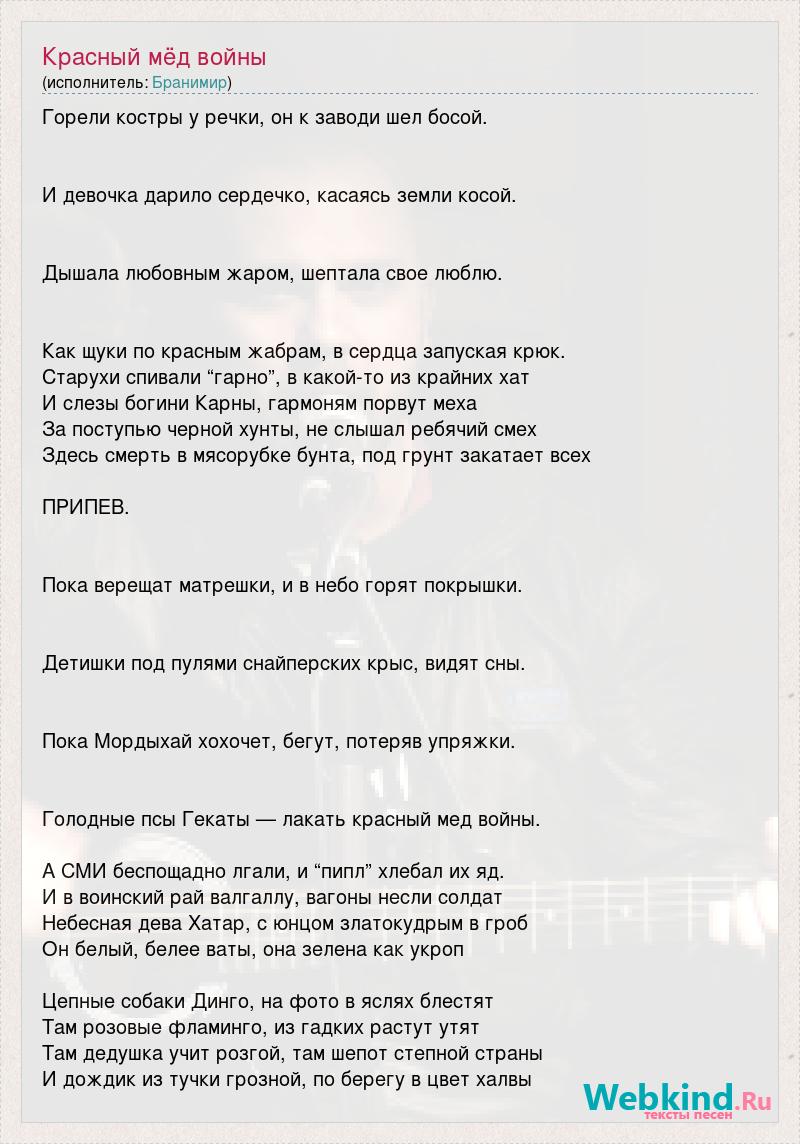 Горели костры у речки, он к заводи шел босой. И девочка дарило сердечко, касаясь земли косой. Дышала любовным жаром, шептала свое люблю. Как щуки по красным жабрам, в сердца запуская крюк. Старухи спивали “гарно”, в какой-то из крайних хат И слезы богини Карны, гармоням порвут меха За поступью черной хунты, не слышал ребячий смех Здесь смерть в мясорубке бунта, под грунт закатает всех ПРИПЕВ. Пока верещат матрешки, и в небо горят покрышки. Детишки под пулями снайперских крыс, видят сны. Пока Мордыхай хохочет, бегут, потеряв упряжки. Голодные псы Гекаты — лакать красный мед войны. А СМИ беспощадно лгали, и “пипл” хлебал их яд. И в воинский рай валгаллу, вагоны несли солдат Небесная дева Хатар, с юнцом златокудрым в гроб Он белый, белее ваты, она зелена как укроп Цепные собаки Динго, на фото в яслях блестят Там розовые фламинго, из гадких растут утят Там дедушка учит розгой, там шепот степной страны И дождик из тучки грозной, по берегу в цвет халвы