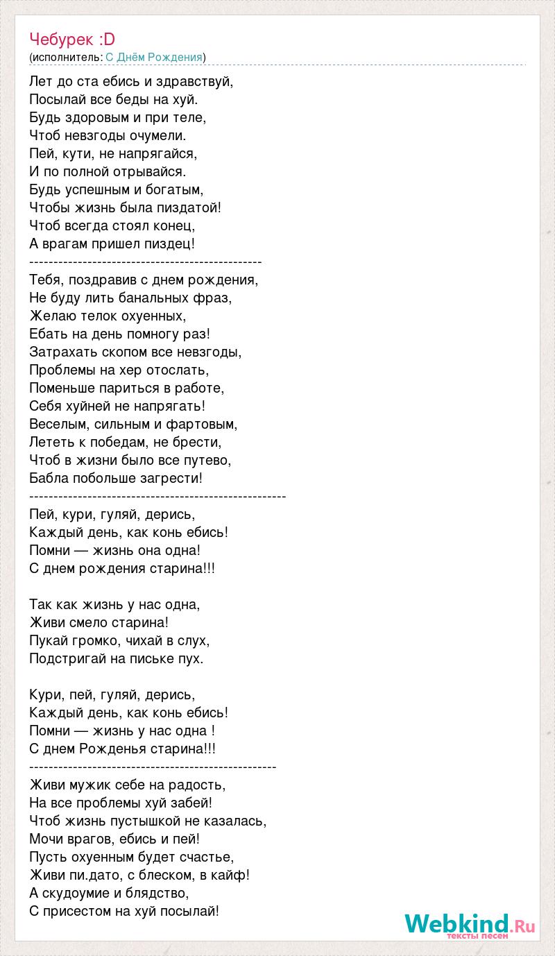 Лет до ста ебись и здравствуй, Посылай все беды на хуй. Будь здоровым и при теле, Чтоб невзгоды очумели. Пей, кути, не напрягайся, И по полной отрывайся. Будь успешным и богатым, Чтобы жизнь была пиздатой! Чтоб всегда стоял конец, А врагам пришел пиздец! ------------------------------------------------ Тебя, поздравив с днем рождения, Не буду лить банальных фраз, Желаю телок охуенных, Ебать на день помногу раз! Затрахать скопом все невзгоды, Проблемы на хер отослать, Поменьше париться в работе, Себя хуйней не напрягать! Веселым, сильным и фартовым, Лететь к победам, не брести, Чтоб в жизни было все путево, Бабла побольше загрести! ----------------------------------------------------- Пей, кури, гуляй, дерись, Каждый день, как конь ебись! Помни — жизнь она одна! С днем рождения старина!!! Так как жизнь у нас одна, Живи смело старина! Пукай громко, чихай в слух, Подстригай на письке пух. Кури, пей, гуляй, дерись, Каждый день, как конь ебись! Помни — жизнь у нас одна ! С днем Рожденья старина!!! --------------------------------------------------- Живи мужик себе на радость, На все проблемы хуй забей! Чтоб жизнь пустышкой не казалась, Мочи врагов, ебись и пей! Пусть охуенным будет счастье, Живи пи.дато, с блеском, в кайф! А скудоумие и блядство, С присестом на хуй посылай!