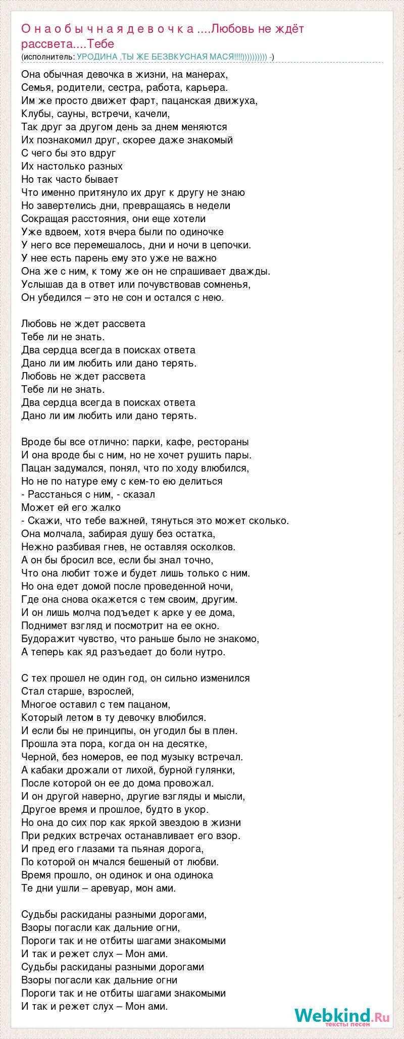 Она обычная девочка в жизни, на манерах, Семья, родители, сестра, работа, карьера. Им же просто движет фарт, пацанская движуха, Клубы, сауны, встречи, качели, Так друг за другом день за днем меняются Их познакомил друг, скорее даже знакомый С чего бы это вдруг Их настолько разных Но так часто бывает Что именно притянуло их друг к другу не знаю Но завертелись дни, превращаясь в недели Сокращая расстояния, они еще хотели Уже вдвоем, хотя вчера были по одиночке У него все перемешалось, дни и ночи в цепочки. У нее есть парень ему это уже не важно Она же с ним, к тому же он не спрашивает дважды. Услышав да в ответ или почувствовав сомненья, Он убедился – это не сон и остался с нею. Любовь не ждет рассвета Тебе ли не знать. Два сердца всегда в поисках ответа Дано ли им любить или дано терять. Любовь не ждет рассвета Тебе ли не знать. Два сердца всегда в поисках ответа Дано ли им любить или дано терять. Вроде бы все отлично: парки, кафе, рестораны И она вроде бы с ним, но не хочет рушить пары. Пацан задумался, понял, что по ходу влюбился, Но не по натуре ему с кем-то ею делиться - Расстанься с ним, - сказал Может ей его жалко - Скажи, что тебе важней, тянуться это может сколько. Она молчала, забирая душу без остатка, Нежно разбивая гнев, не оставляя осколков. А он бы бросил все, если бы знал точно, Что она любит тоже и будет лишь только с ним. Но она едет домой после проведенной ночи, Где она снова окажется с тем своим, другим. И он лишь молча подъедет к арке у ее дома, Поднимет взгляд и посмотрит на ее окно. Будоражит чувство, что раньше было не знакомо, А теперь как яд разъедает до боли нутро. С тех прошел не один год, он сильно изменился Стал старше, взрослей, Многое оставил с тем пацаном, Который летом в ту девочку влюбился. И если бы не принципы, он угодил бы в плен. Прошла эта пора, когда он на десятке, Черной, без номеров, ее под музыку встречал. А кабаки дрожали от лихой, бурной гулянки, После которой он ее до дома провожал. И он другой наверно, другие взгляды и мысли, Другое время и прошлое, будто в укор. Но она до сих пор как яркой звездою в жизни При редких встречах останавливает его взор. И пред его глазами та пьяная дорога, По которой он мчался бешеный от любви. Время прошло, он одинок и она одинока Те дни ушли – аревуар, мон ами. Судьбы раскиданы разными дорогами, Взоры погасли как дальние огни, Пороги так и не отбиты шагами знакомыми И так и режет слух – Мон ами. Судьбы раскиданы разными дорогами Взоры погасли как дальние огни Пороги так и не отбиты шагами знакомыми И так и режет слух – Мон ами.