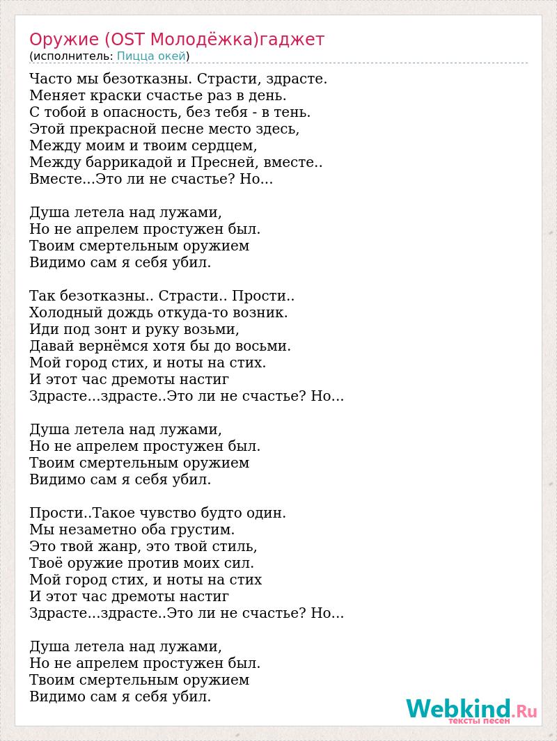 Часто мы безотказны. Страсти, здрасте. Меняет краски счастье раз в день. С тобой в опасность, без тебя - в тень. Этой прекрасной песне место здесь, Между моим и твоим сердцем, Между баррикадой и Пресней, вместе.. Вместе...Это ли не счастье? Но... Душа летела над лужами, Но не апрелем простужен был. Твоим смертельным оружием Видимо сам я себя убил. Так безотказны.. Страсти.. Прости.. Холодный дождь откуда-то возник. Иди под зонт и руку возьми, Давай вернёмся хотя бы до восьми. Мой город стих, и ноты на стих. И этот час дремоты настиг Здрасте...здрасте..Это ли не счастье? Но... Душа летела над лужами, Но не апрелем простужен был. Твоим смертельным оружием Видимо сам я себя убил. Прости..Такое чувство будто один. Мы незаметно оба грустим. Это твой жанр, это твой стиль, Твоё оружие против моих сил. Мой город стих, и ноты на стих И этот час дремоты настиг Здрасте...здрасте..Это ли не счастье? Но... Душа летела над лужами, Но не апрелем простужен был. Твоим смертельным оружием Видимо сам я себя убил.