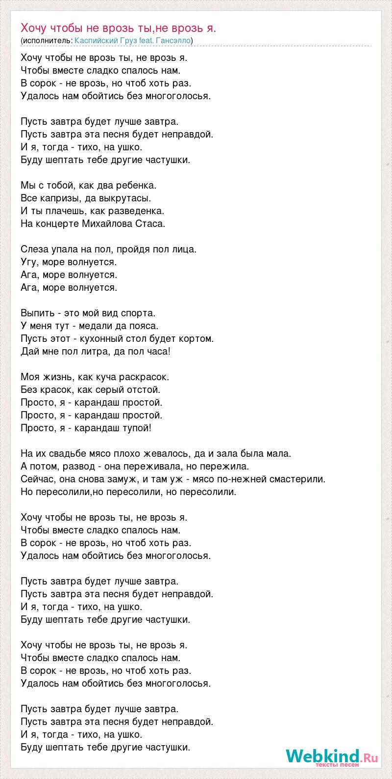Хочу чтобы не врозь ты, не врозь я. Чтобы вместе сладко спалось нам. В сорок - не врозь, но чтоб хоть раз. Удалось нам обойтись без многоголосья. Пусть завтра будет лучше завтра. Пусть завтра эта песня будет неправдой. И я, тогда - тихо, на ушко. Буду шептать тебе другие частушки. Мы с тобой, как два ребенка. Все капризы, да выкрутасы. И ты плачешь, как разведенка. На концерте Михайлова Стаса. Слеза упала на пол, пройдя пол лица. Угу, море волнуется. Ага, море волнуется. Ага, море волнуется. Выпить - это мой вид спорта. У меня тут - медали да пояса. Пусть этот - кухонный стол будет кортом. Дай мне пол литра, да пол часа! Моя жизнь, как куча раскрасок. Без красок, как серый отстой. Просто, я - карандаш простой. Просто, я - карандаш простой. Просто, я - карандаш тупой! На их свадьбе мясо плохо жевалось, да и зала была мала. А потом, развод - она переживала, но пережила. Сейчас, она снова замуж, и там уж - мясо по-нежней смастерили. Но пересолили,но пересолили, но пересолили. Хочу чтобы не врозь ты, не врозь я. Чтобы вместе сладко спалось нам. В сорок - не врозь, но чтоб хоть раз. Удалось нам обойтись без многоголосья. Пусть завтра будет лучше завтра. Пусть завтра эта песня будет неправдой. И я, тогда - тихо, на ушко. Буду шептать тебе другие частушки. Хочу чтобы не врозь ты, не врозь я. Чтобы вместе сладко спалось нам. В сорок - не врозь, но чтоб хоть раз. Удалось нам обойтись без многоголосья. Пусть завтра будет лучше завтра. Пусть завтра эта песня будет неправдой. И я, тогда - тихо, на ушко. Буду шептать тебе другие частушки.