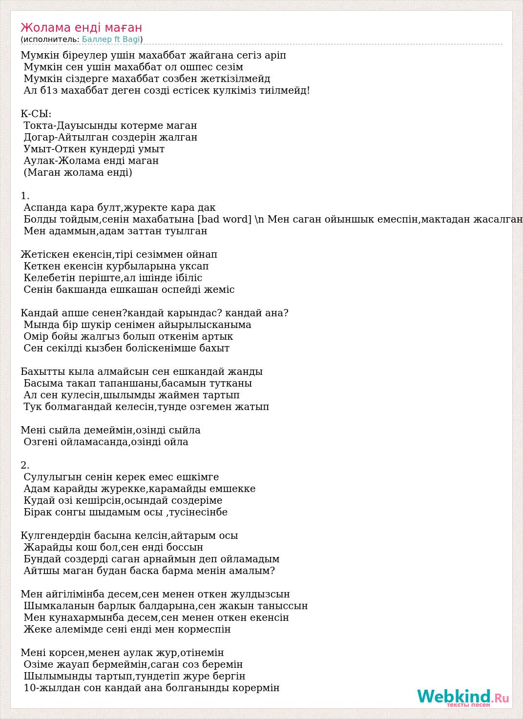 Мумкiн бiреулер ушiн махаббат жайгана сегiз арiп Мумкiн сен ушiн махаббат ол ошпес сезiм Мумкiн сiздерге махаббат созбен жеткiзiлмейд Ал б1з махаббат деген создi естiсек кулкiмiз тиiлмейд! К-СЫ: Токта-Дауысынды котерме маган Догар-Айтылган создерiн жалган Умыт-Откен кундердi умыт Аулак-Жолама ендi маган (Маган жолама ендi) 1. Аспанда кара булт,журекте кара дак Болды тойдым,сенiн махабатына [bad word] \n Мен саган ойыншык емеспiн,мактадан жасалган Мен адаммын,адам заттан туылган Жетiскен екенсiн,тiрi сезiммен ойнап Кеткен екенсiн курбыларына уксап Келебетiн перiште,ал iшiнде iбiлiс Сенiн бакшанда ешкашан оспейдi жемiс Кандай апше сенен?кандай карындас? кандай ана? Мында бiр шукiр сенiмен айырылысканыма Омiр бойы жалгыз болып откенiм артык Сен секiлдi кызбен болiскенiмше бахыт Бахытты кыла алмайсын сен ешкандай жанды Басыма такап тапаншаны,басамын тутканы Ал сен кулесiн,шылымды жаймен тартып Тук болмагандай келесiн,тунде озгемен жатып Менi сыйла демеймiн,озiндi сыйла Озгенi ойламасанда,озiндi ойла 2. Сулулыгын сенiн керек емес ешкiмге Адам карайды журекке,карамайды емшекке Кудай озi кешiрсiн,осындай создерiме Бiрак сонгы шыдамым осы ,тусiнесiнбе Кулгендердiн басына келсiн,айтарым осы Жарайды кош бол,сен ендi боссын Бундай создердi саган арнаймын деп ойламадым Айтшы маган будан баска барма менiн амалым? Мен айгiлiмiнба десем,сен менен откен жулдызсын Шымкаланын барлык балдарына,сен жакын таныссын Мен кунахармынба десем,сен менен откен екенсiн Жеке алемiмде сенi ендi мен кормеспiн Менi корсен,менен аулак жур,отiнемiн Озiме жауап бермеймiн,саган соз беремiн Шылымынды тартып,тундетiп журе бергiн 10-жылдан сон кандай ана болганынды корермiн