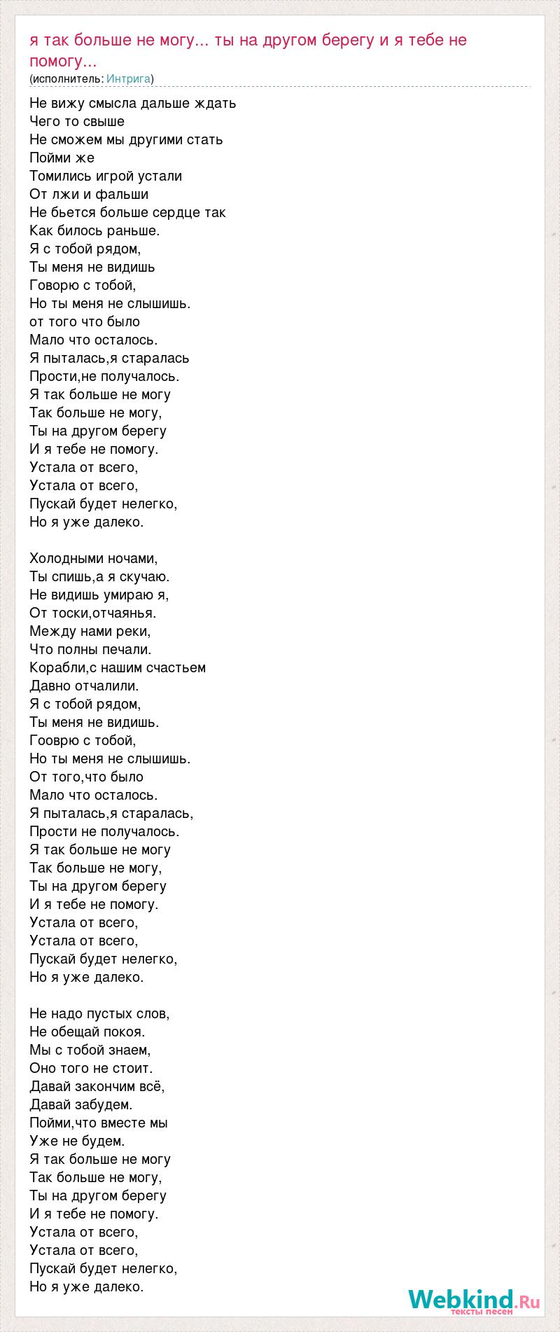 Не вижу смысла дальше ждать Чего то свыше Не сможем мы другими стать Пойми же Томились игрой устали От лжи и фальши Не бьется больше сердце так Как билось раньше. Я с тобой рядом, Ты меня не видишь Говорю с тобой, Но ты меня не слышишь. от того что было Мало что осталось. Я пыталась,я старалась Прости,не получалось. Я так больше не могу Так больше не могу, Ты на другом берегу И я тебе не помогу. Устала от всего, Устала от всего, Пускай будет нелегко, Но я уже далеко. Холодными ночами, Ты спишь,а я скучаю. Не видишь умираю я, От тоски,отчаянья. Между нами реки, Что полны печали. Корабли,с нашим счастьем Давно отчалили. Я с тобой рядом, Ты меня не видишь. Гооврю с тобой, Но ты меня не слышишь. От того,что было Мало что осталось. Я пыталась,я старалась, Прости не получалось. Я так больше не могу Так больше не могу, Ты на другом берегу И я тебе не помогу. Устала от всего, Устала от всего, Пускай будет нелегко, Но я уже далеко. Не надо пустых слов, Не обещай покоя. Мы с тобой знаем, Оно того не стоит. Давай закончим всё, Давай забудем. Пойми,что вместе мы Уже не будем. Я так больше не могу Так больше не могу, Ты на другом берегу И я тебе не помогу. Устала от всего, Устала от всего, Пускай будет нелегко, Но я уже далеко.