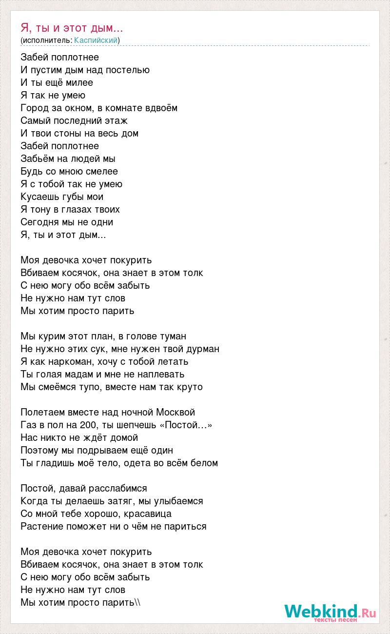 Забей поплотнее И пустим дым над постелью И ты ещё милее Я так не умею Город за окном, в комнате вдвоём Самый последний этаж И твои стоны на весь дом Забей поплотнее Забьём на людей мы Будь со мною смелее Я с тобой так не умею Кусаешь губы мои Я тону в глазах твоих Сегодня мы не одни Я, ты и этот дым... Моя девочка хочет покурить Вбиваем косячок, она знает в этом толк С нею могу обо всём забыть Не нужно нам тут слов Мы хотим просто парить Мы курим этот план, в голове туман Не нужно этих сук, мне нужен твой дурман Я как наркоман, хочу с тобой летать Ты голая мадам и мне не наплевать Мы смеёмся тупо, вместе нам так круто Полетаем вместе над ночной Москвой Газ в пол на 200, ты шепчешь «Постой…» Нас никто не ждёт домой Поэтому мы подрываем ещё один Ты гладишь моё тело, одета во всём белом Постой, давай расслабимся Когда ты делаешь затяг, мы улыбаемся Со мной тебе хорошо, красавица Растение поможет ни о чём не париться Моя девочка хочет покурить Вбиваем косячок, она знает в этом толк С нею могу обо всём забыть Не нужно нам тут слов Мы хотим просто парить\\