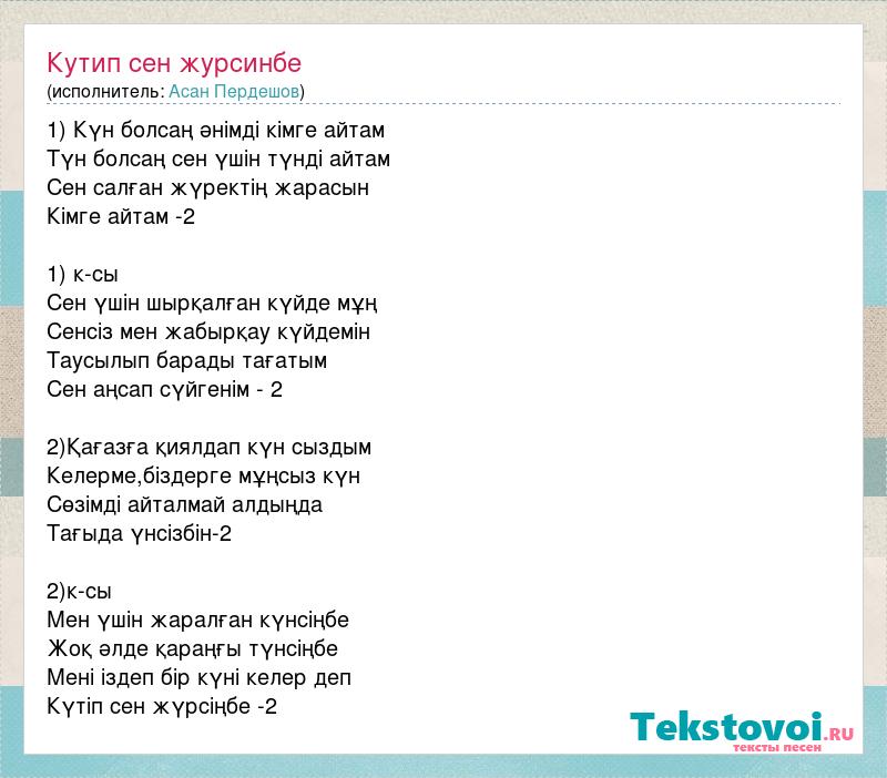 1) Күн болсаң әнімді кімге айтам Түн болсаң сен үшін түнді айтам Сен салған жүректің жарасын Кімге айтам -2 1) к-сы Сен үшін шырқалған күйде мұң Сенсіз мен жабырқау күйдемін Таусылып барады тағатым Сен аңсап сүйгенім - 2 2)Қағазға қиялдап күн сыздым Келерме,біздерге мұңсыз күн Сөзімді айталмай алдыңда Тағыда үнсізбін-2 2)к-сы Мен үшін жаралған күнсіңбе Жоқ әлде қараңғы түнсіңбе Мені іздеп бір күні келер деп Күтіп сен жүрсіңбе -2