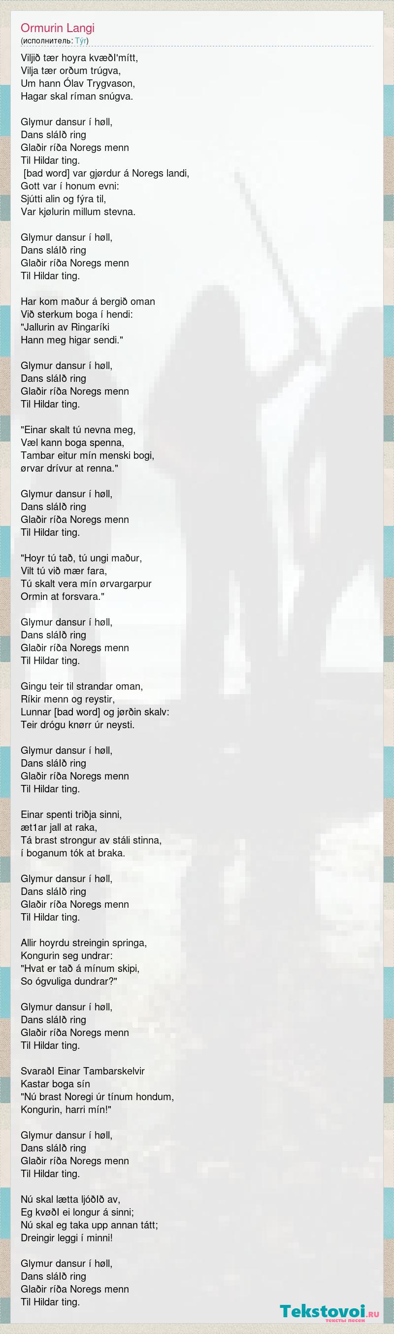 Viljið tær hoyra kvæðI'mítt, Vilja tær orðum trúgva, Um hann Ólav Trygvason, Hagar skal ríman snúgva. Glymur dansur í høll, Dans sláIð ring Glaðir ríða Noregs menn Til Hildar ting. [bad word] var gjørdur á Noregs landi, Gott var í honum evni: Sjútti alin og fýra til, Var kjølurin millum stevna. Glymur dansur í høll, Dans sláIð ring Glaðir ríða Noregs menn Til Hildar ting. Har kom maður á bergið oman Við sterkum boga í hendi: "Jallurin av Ringaríki Hann meg higar sendi." Glymur dansur í høll, Dans sláIð ring Glaðir ríða Noregs menn Til Hildar ting. "Einar skalt tú nevna meg, Væl kann boga spenna, Tambar eitur mín menski bogi, ørvar drívur at renna." Glymur dansur í høll, Dans sláIð ring Glaðir ríða Noregs menn Til Hildar ting. "Hoyr tú tað, tú ungi maður, Vilt tú við mær fara, Tú skalt vera mín ørvargarpur Ormin at forsvara." Glymur dansur í høll, Dans sláIð ring Glaðir ríða Noregs menn Til Hildar ting. Gingu teir til strandar oman, Ríkir menn og reystir, Lunnar [bad word] og jørðin skalv: Teir drógu knørr úr neysti. Glymur dansur í høll, Dans sláIð ring Glaðir ríða Noregs menn Til Hildar ting. Einar spenti triðja sinni, æt1ar jall at raka, Tá brast strongur av stáli stinna, í boganum tók at braka. Glymur dansur í høll, Dans sláIð ring Glaðir ríða Noregs menn Til Hildar ting. Allir hoyrdu streingin springa, Kongurin seg undrar: "Hvat er tað á mínum skipi, So ógvuliga dundrar?" Glymur dansur í høll, Dans sláIð ring Glaðir ríða Noregs menn Til Hildar ting. SvaraðI Einar Tambarskelvir Kastar boga sín "Nú brast Noregi úr tínum hondum, Kongurin, harri mín!" Glymur dansur í høll, Dans sláIð ring Glaðir ríða Noregs menn Til Hildar ting. Nú skal lætta ljóðIð av, Eg kvøðI ei longur á sinni; Nú skal eg taka upp annan tátt; Dreingir leggi í minni! Glymur dansur í høll, Dans sláIð ring Glaðir ríða Noregs menn Til Hildar ting.