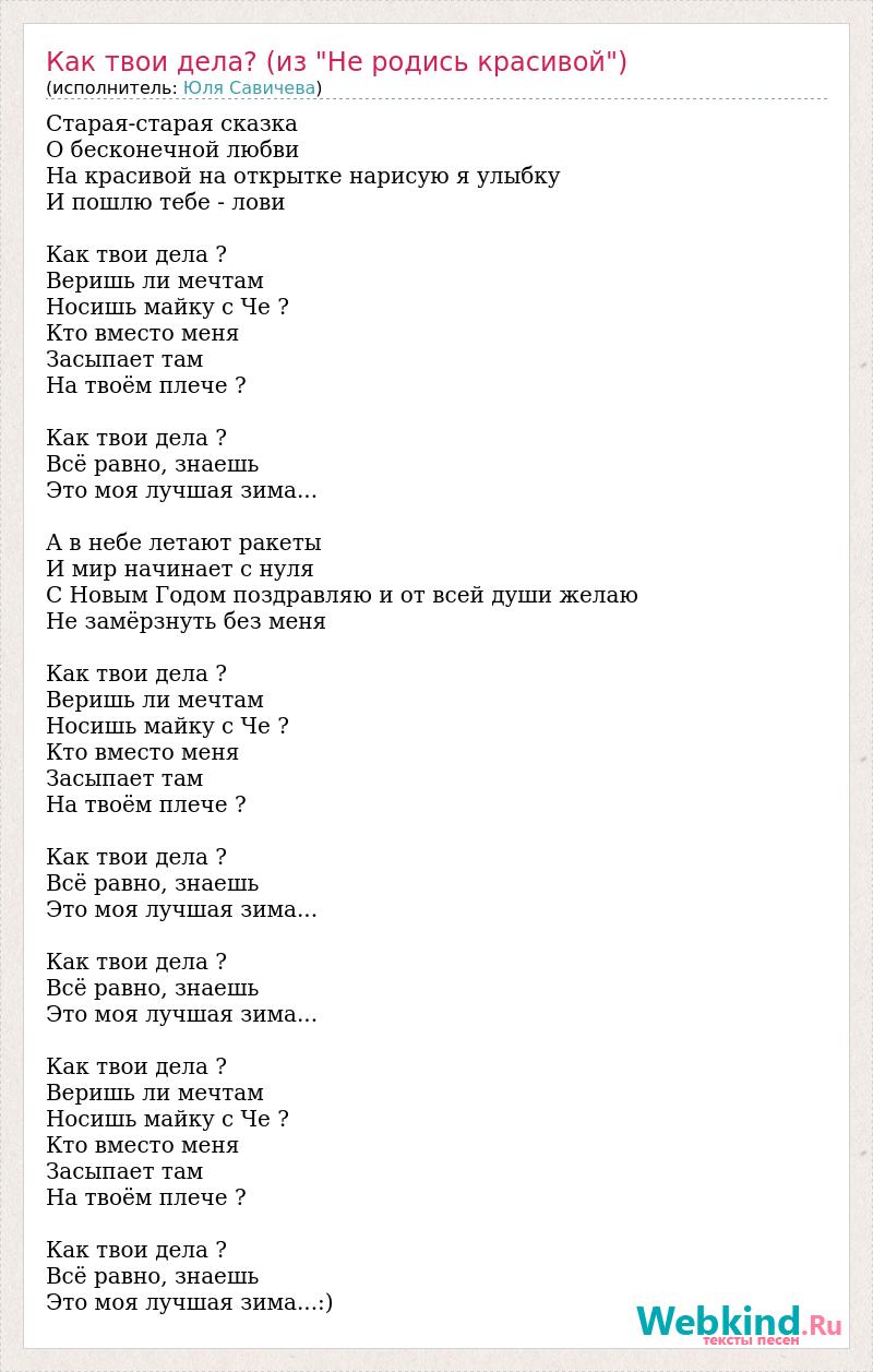 Старая-старая сказка О бесконечной любви На красивой на открытке нарисую я улыбку И пошлю тебе - лови Как твои дела ? Веришь ли мечтам Носишь майку с Че ? Кто вместо меня Засыпает там На твоём плече ? Как твои дела ? Всё равно, знаешь Это моя лучшая зима... А в небе летают ракеты И мир начинает с нуля С Новым Годом поздравляю и от всей души желаю Не замёрзнуть без меня Как твои дела ? Веришь ли мечтам Носишь майку с Че ? Кто вместо меня Засыпает там На твоём плече ? Как твои дела ? Всё равно, знаешь Это моя лучшая зима... Как твои дела ? Всё равно, знаешь Это моя лучшая зима... Как твои дела ? Веришь ли мечтам Носишь майку с Че ? Кто вместо меня Засыпает там На твоём плече ? Как твои дела ? Всё равно, знаешь Это моя лучшая зима...:)