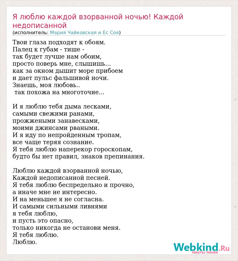 Твои глаза подходят к обоям. Палец к губам - тише - так будет лучше нам обоим, просто поверь мне, слышишь... как за окном дышит море прибоем и дает пульс фальшивой ночи. Знаешь, моя любовь.. так похожа на многоточие... И я люблю тебя дыма лесками, самыми свежими ранами, прожжеными занавесками, моими джинсами рваными. И я иду по непройденным тропам, все чаще теряя сознание. Я тебя люблю наперекор гороскопам, будто бы нет правил, знаков препинания. Люблю каждой взорванной ночью, Каждой недописанной песней. Я тебя люблю беспредельно и прочно, а иначе мне не интересно. И на меньшее я не согласна. И самыми сильными ливнями я тебя люблю, и пусть это опасно, только никогда не останови меня. Я тебя люблю. Люблю.