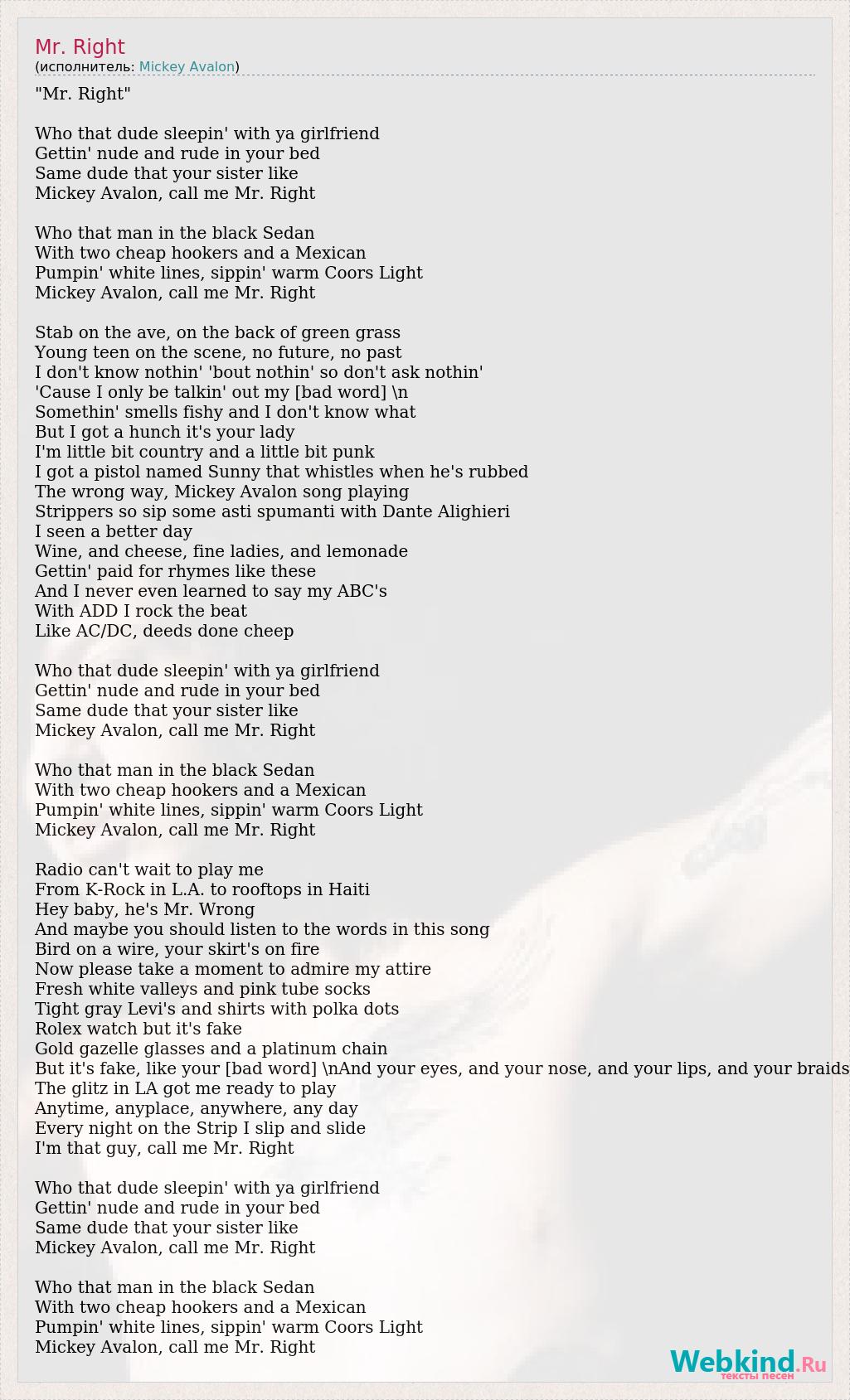 "Mr. Right" Who that dude sleepin' with ya girlfriend Gettin' nude and rude in your bed Same dude that your sister like Mickey Avalon, call me Mr. Right Who that man in the black Sedan With two cheap hookers and a Mexican Pumpin' white lines, sippin' warm Coors Light Mickey Avalon, call me Mr. Right Stab on the ave, on the back of green grass Young teen on the scene, no future, no past I don't know nothin' 'bout nothin' so don't ask nothin' 'Cause I only be talkin' out my [bad word] \n Somethin' smells fishy and I don't know what But I got a hunch it's your lady I'm little bit country and a little bit punk I got a pistol named Sunny that whistles when he's rubbed The wrong way, Mickey Avalon song playing Strippers so sip some asti spumanti with Dante Alighieri I seen a better day Wine, and cheese, fine ladies, and lemonade Gettin' paid for rhymes like these And I never even learned to say my ABC's With ADD I rock the beat Like AC/DC, deeds done cheep Who that dude sleepin' with ya girlfriend Gettin' nude and rude in your bed Same dude that your sister like Mickey Avalon, call me Mr. Right Who that man in the black Sedan With two cheap hookers and a Mexican Pumpin' white lines, sippin' warm Coors Light Mickey Avalon, call me Mr. Right Radio can't wait to play me From K-Rock in L.A. to rooftops in Haiti Hey baby, he's Mr. Wrong And maybe you should listen to the words in this song Bird on a wire, your skirt's on fire Now please take a moment to admire my attire Fresh white valleys and pink tube socks Tight gray Levi's and shirts with polka dots Rolex watch but it's fake Gold gazelle glasses and a platinum chain But it's fake, like your [bad word] \nAnd your eyes, and your nose, and your lips, and your braids The glitz in LA got me ready to play Anytime, anyplace, anywhere, any day Every night on the Strip I slip and slide I'm that guy, call me Mr. Right Who that dude sleepin' with ya girlfriend Gettin' nude and rude in your bed Same dude that your sister like Mickey Avalon, call me Mr. Right Who that man in the black Sedan With two cheap hookers and a Mexican Pumpin' white lines, sippin' warm Coors Light Mickey Avalon, call me Mr. Right
