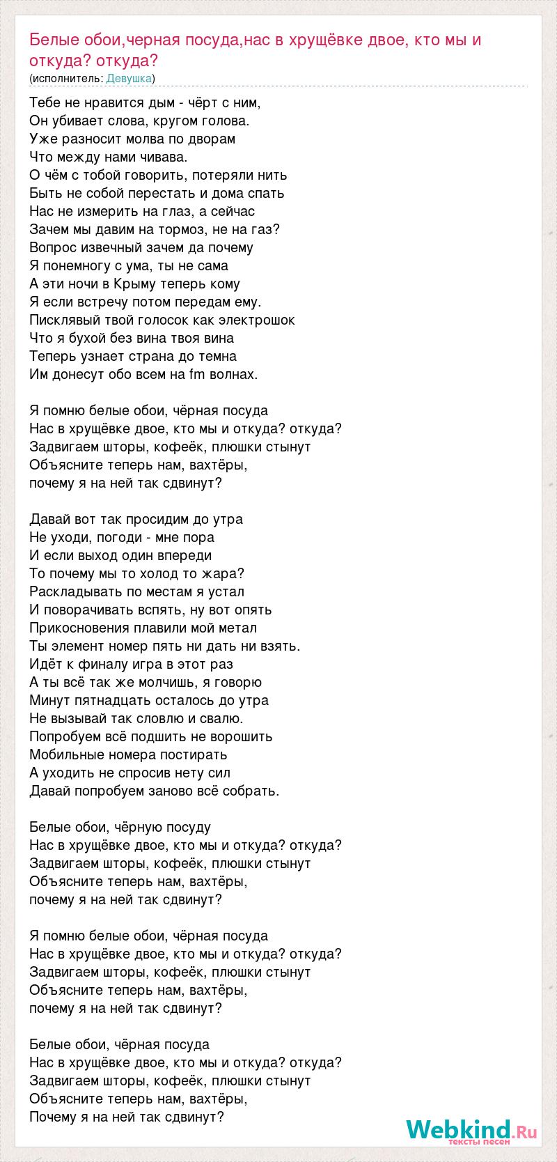 Тебе не нравится дым - чёрт с ним, Он убивает слова, кругом голова. Уже разносит молва по дворам Что между нами чивава. О чём с тобой говорить, потеряли нить Быть не собой перестать и дома спать Нас не измерить на глаз, а сейчас Зачем мы давим на тормоз, не на газ? Вопрос извечный зачем да почему Я понемногу с ума, ты не сама А эти ночи в Крыму теперь кому Я если встречу потом передам ему. Писклявый твой голосок как электрошок Что я бухой без вина твоя вина Теперь узнает страна до темна Им донесут обо всем на fm волнах. Я помню белые обои, чёрная посуда Нас в хрущёвке двое, кто мы и откуда? откуда? Задвигаем шторы, кофеёк, плюшки стынут Объясните теперь нам, вахтёры, почему я на ней так сдвинут? Давай вот так просидим до утра Не уходи, погоди - мне пора И если выход один впереди То почему мы то холод то жара? Раскладывать по местам я устал И поворачивать вспять, ну вот опять Прикосновения плавили мой метал Ты элемент номер пять ни дать ни взять. Идёт к финалу игра в этот раз А ты всё так же молчишь, я говорю Минут пятнадцать осталось до утра Не вызывай так словлю и свалю. Попробуем всё подшить не ворошить Мобильные номера постирать А уходить не спросив нету сил Давай попробуем заново всё собрать. Белые обои, чёрную посуду Нас в хрущёвке двое, кто мы и откуда? откуда? Задвигаем шторы, кофеёк, плюшки стынут Объясните теперь нам, вахтёры, почему я на ней так сдвинут? Я помню белые обои, чёрная посуда Нас в хрущёвке двое, кто мы и откуда? откуда? Задвигаем шторы, кофеёк, плюшки стынут Объясните теперь нам, вахтёры, почему я на ней так сдвинут? Белые обои, чёрная посуда Нас в хрущёвке двое, кто мы и откуда? откуда? Задвигаем шторы, кофеёк, плюшки стынут Объясните теперь нам, вахтёры, Почему я на ней так сдвинут?