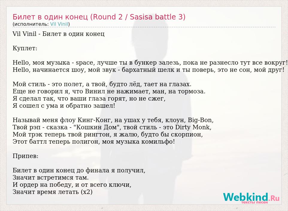 Vil Vinil - Билет в один конец Куплет: Hello, моя музыка - space, лучше ты в бункер залезь, пока не разнесло тут все вокруг! Hello, начинается шоу, мой звук - бархатный шелк и ты поверь, это не сон, мой друг! Мой стиль - это полет, а твой, будто лёд, тает на глазах. Еще не говорил я, что Винил не нажимает, ман, на тормоза. Я сделал так, что ваши глаза горят, но не сжег, Я сошел с ума и обратно зашел! Называй меня флоу Кинг-Конг, на ушах у тебя, клоун, Big-Bon, Твой рэп - сказка - "Кошкин Дом", твой стиль - это Dirty Monk, Мой трэк теперь твой рингтон, я жалю, будто бы скорпион, Этот баттл теперь полигон, моя музыка комильфо! Припев: Билет в один конец до финала я получил, Значит встретимся там. И ордер на победу, и от всего ключи, Значит время летать (x2)