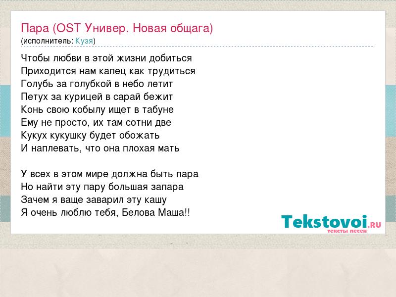 Чтобы любви в этой жизни добиться Приходится нам капец как трудиться Голубь за голубкой в небо летит Петух за курицей в сарай бежит Конь свою кобылу ищет в табуне Ему не просто, их там сотни две Кукух кукушку будет обожать И наплевать, что она плохая мать У всех в этом мире должна быть пара Но найти эту пару большая запара Зачем я ваще заварил эту кашу Я очень люблю тебя, Белова Маша!!