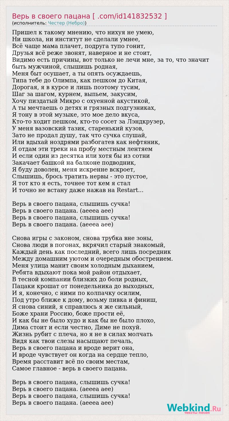Пришел к такому мнению, что нихуя не умею, Ни школа, ни институт не сделали умнее, Всё чаще мама плачет, подруга тупо гонит, Друзья всё реже звонят, наверное и не стоит, Видимо есть причины, вот только не лечи мне, за то, что значит быть мужчиной, слышишь родная, Меня быт осушает, а ты опять осуждаешь, Типа тебе до Олимпа, как пешком до Китая, Дорогая, я в курсе и лишь поэтому тусим, Шаг за шагом, курнем, выпьем, закусим, Хочу пиздатый Микро с охуенной акустикой, А ты мечтаешь о детях и грязных подгузниках, Я тону в этой музыке, это мое дело вкуса, Кто-то ходит пешком, кто-то сосет за Лэндкрузер, У меня вазовский тазик, старенький кузов, Зато не продал душу, так что сучка слушай, Или вдыхай ноздрями разбогатев как нефтяник, Я отдам эти треки на пробу местным лентяем И если один из десятка или хотя бы из сотни Закачает башкой на балконе подводник, Я буду доволен, меня искренне вскроет, Слышишь, брось тратить нервы - это пустое, Я тот кто я есть, точнее тот кем я стал И точно не встану даже нажав на Restart... Верь в своего пацана, слышишь сучка! Верь в своего пацана. (аеееа аее) Верь в своего пацана, слышишь сучка! Верь в своего пацана. (аеееа аее) Снова игры с законом, снова трубка вне зоны, Снова люди в погонах, вкрячил старый знакомый, Каждый день как последний, всего лишь посредник Между домашним уютом и очередным обострением. Меня улица манит своим холодным дыханием, Ребята вдыхают пока мой район отдыхает, В тесной компании близких до боли родных, Пацаки крошат от понедельника до выходных, И я, конечно, с ними по колпачку осилим, Под утро ближе к дому, возьму пивка и финиш, Я снова синий, я справлюсь я же сильный, Боже храни Россию, боже прости её, И как бы не было худо и как бы не было плохо, Дима стоит и если честно, Диме не похуй. Жизнь рубит с плеча, но я не в силах молчать Видя как твои слезы насыщают печаль, Верь в своего пацана и вроде верит она, И вроде чувствует он когда на сердце тепло, Время расставит всё по своим местам, Самое главное - верь в своего пацана. Верь в своего пацана, слышишь сучка! Верь в своего пацана. (аеееа аее) Верь в своего пацана, слышишь сучка! Верь в своего пацана. (аеееа аее)