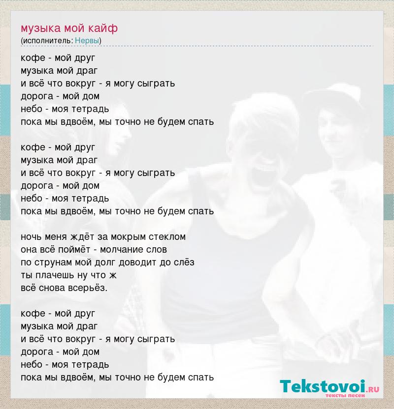 кофе - мой друг музыка мой драг и всё что вокруг - я могу сыграть дорога - мой дом небо - моя тетрадь пока мы вдвоём, мы точно не будем спать кофе - мой друг музыка мой драг и всё что вокруг - я могу сыграть дорога - мой дом небо - моя тетрадь пока мы вдвоём, мы точно не будем спать ночь меня ждёт за мокрым стеклом она всё поймёт - молчание слов по струнам мой долг доводит до слёз ты плачешь ну что ж всё снова всерьёз. кофе - мой друг музыка мой драг и всё что вокруг - я могу сыграть дорога - мой дом небо - моя тетрадь пока мы вдвоём, мы точно не будем спать