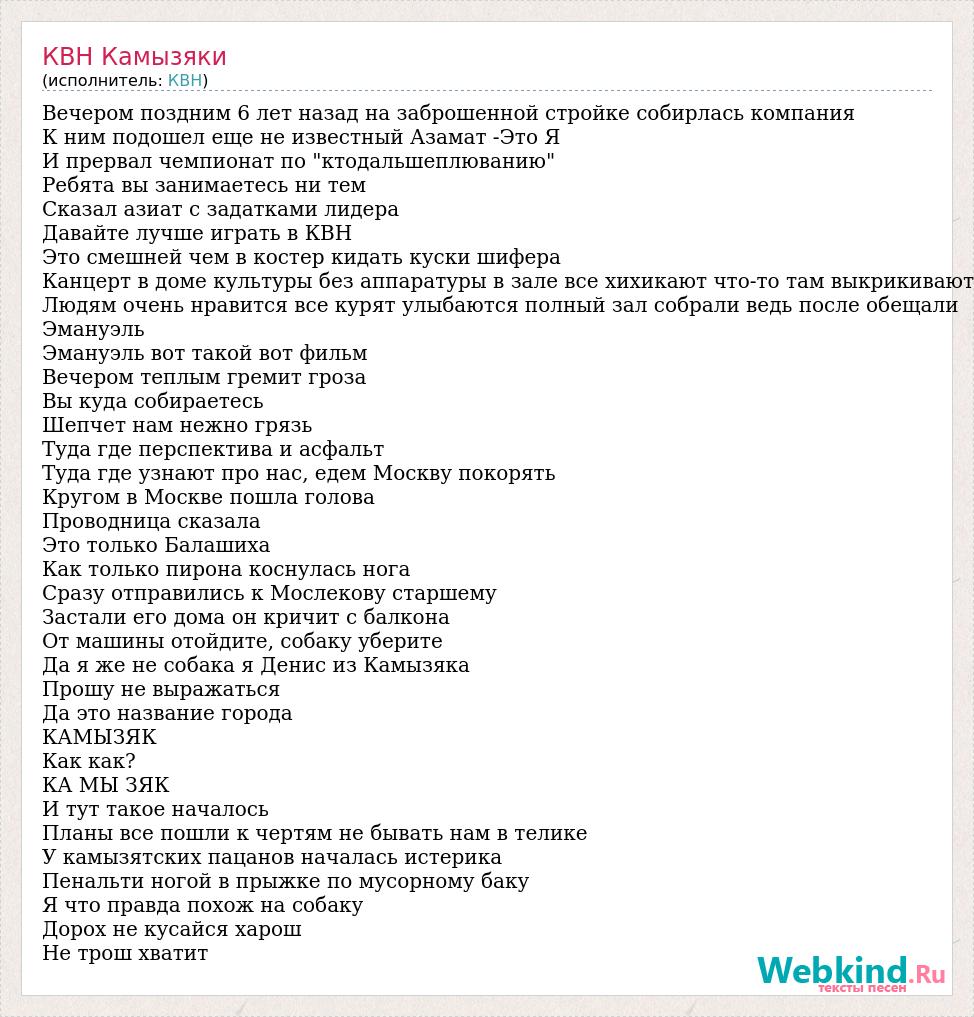 Вечером поздним 6 лет назад на заброшенной стройке собирлась компания К ним подошел еще не известный Азамат -Это Я И прервал чемпионат по "ктодальшеплюванию" Ребята вы занимаетесь ни тем Сказал азиат с задатками лидера Давайте лучше играть в КВН Это смешней чем в костер кидать куски шифера Канцерт в доме культуры без аппаратуры в зале все хихикают что-то там выкрикивают Людям очень нравится все курят улыбаются полный зал собрали ведь после обещали Эмануэль Эмануэль вот такой вот фильм Вечером теплым гремит гроза Вы куда собираетесь Шепчет нам нежно грязь Туда где перспектива и асфальт Туда где узнают про нас, едем Москву покорять Кругом в Москве пошла голова Проводница сказала Это только Балашиха Как только пирона коснулась нога Сразу отправились к Мослекову старшему Застали его дома он кричит с балкона От машины отойдите, собаку уберите Да я же не собака я Денис из Камызяка Прошу не выражаться Да это название города КАМЫЗЯК Как как? КА МЫ ЗЯК И тут такое началось Планы все пошли к чертям не бывать нам в телике У камызятских пацанов началась истерика Пенальти ногой в прыжке по мусорному баку Я что правда похож на собаку Дорох не кусайся харош Не трош хватит