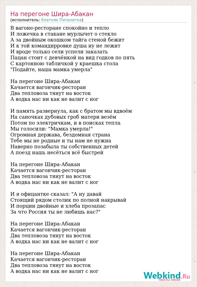В вагоне-ресторане спокойно и тепло И ложечка в стакане мурлычет о стекло А за двойным окошком тайга стеной бежит И к той командирровке душа ну не лежит И вроде только сели успели заказать Пацан стоит с девчёнкой на вид годков по пять С картонною табличкой у краешка стола "Подайте, наша мамка умерла" На перегоне Шира-Абакан Качается вагончик-ресторан Два тепловоза тянут на восток А водка нас ни как не валит с ног И память развернула, как с братом мы вдвоём На саночках дубовых гроб матери везём Потом по электричкам, и в поисках тепла Мы голосили: "Мамка умерла!" Огромная держава, бездомная страна Тебе мы не родные и ты нам не нужна Наверно позабыла ты собственных детей А поезд нашь несёться всё быстрей На перегоне Шира-Абакан Качается вагончик-ресторан Два тепловоза тянут на восток А водка нас ни как не валит с ног И я офицантке сказал: "А ну давай Стоящий рядом столик по полной накрывай И порции двойные и хлеба прозапас За что Россия ты не любишь нас?" На перегоне Шира-Абакан Качается вагончик-ресторан Два тепловоза тянут на восток А водка нас ни как не валит с ног На перегоне Шира-Абакан Качается вагончик-ресторан Два тепловоза тянут на восток А водка нас ни как не валит с ног