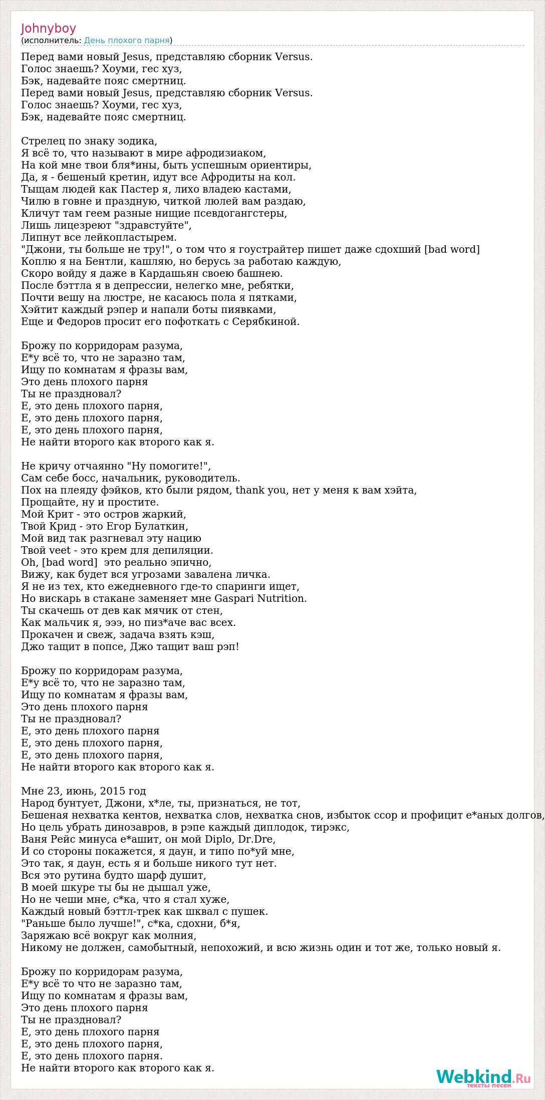 Перед вами новый Jesus, представляю сборник Versus. Голос знаешь? Хоуми, гес хуз, Бэк, надевайте пояс смертниц. Перед вами новый Jesus, представляю сборник Versus. Голос знаешь? Хоуми, гес хуз, Бэк, надевайте пояс смертниц. Стрелец по знаку зодика, Я всё то, что называют в мире афродизиаком, На кой мне твои бля*ины, быть успешным ориентиры, Да, я - бешеный кретин, идут все Афродиты на кол. Тыщам людей как Пастер я, лихо владею кастами, Чилю в говне и праздную, читкой люлей вам раздаю, Кличут там геем разные нищие псевдогангстеры, Лишь лицезреют "здравстуйте", Липнут все лейкопластырем. "Джони, ты больше не тру!", о том что я гоустрайтер пишет даже сдохший [bad word] Коплю я на Бентли, кашляю, но берусь за работаю каждую, Скоро войду я даже в Кардашьян своею башнею. После бэттла я в депрессии, нелегко мне, ребятки, Почти вешу на люстре, не касаюсь пола я пятками, Хэйтит каждый рэпер и напали боты пиявками, Еще и Федоров просит его пофоткать с Серябкиной. Брожу по корридорам разума, Е*у всё то, что не заразно там, Ищу по комнатам я фразы вам, Это день плохого парня Ты не праздновал? Е, это день плохого парня, Е, это день плохого парня, Е, это день плохого парня, Не найти второго как второго как я. Не кричу отчаянно "Ну помогите!", Сам себе босс, начальник, руководитель. Пох на плеяду фэйков, кто были рядом, thank you, нет у меня к вам хэйта, Прощайте, ну и простите. Мой Крит - это остров жаркий, Твой Крид - это Егор Булаткин, Мой вид так разгневал эту нацию Твой veet - это крем для депиляции. Oh, [bad word] это реально эпично, Вижу, как будет вся угрозами завалена личка. Я не из тех, кто ежедневного где-то спаринги ищет, Но вискарь в стакане заменяет мне Gaspari Nutrition. Ты скачешь от дев как мячик от стен, Как мальчик я, эээ, но пиз*аче вас всех. Прокачен и свеж, задача взять кэш, Джо тащит в попсе, Джо тащит ваш рэп! Брожу по корридорам разума, Е*у всё то, что не заразно там, Ищу по комнатам я фразы вам, Это день плохого парня Ты не праздновал? Е, это день плохого парня Е, это день плохого парня, Е, это день плохого парня, Не найти второго как второго как я. Мне 23, июнь, 2015 год Народ бунтует, Джони, х*ле, ты, признаться, не тот, Бешеная нехватка кентов, нехватка слов, нехватка снов, избыток ссор и профицит е*аных долгов, Но цель убрать динозавров, в рэпе каждый диплодок, тирэкс, Ваня Рейс минуса е*ашит, он мой Diplo, Dr.Dre, И со стороны покажется, я даун, и типо по*уй мне, Это так, я даун, есть я и больше никого тут нет. Вся это рутина будто шарф душит, В моей шкуре ты бы не дышал уже, Но не чеши мне, с*ка, что я стал хуже, Каждый новый бэттл-трек как шквал с пушек. "Раньше было лучше!", с*ка, сдохни, б*я, Заряжаю всё вокруг как молния, Никому не должен, самобытный, непохожий, и всю жизнь один и тот же, только новый я. Брожу по корридорам разума, Е*у всё то что не заразно там, Ищу по комнатам я фразы вам, Это день плохого парня Ты не праздновал? Е, это день плохого парня Е, это день плохого парня, Е, это день плохого парня. Не найти второго как второго как я.
