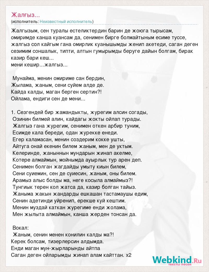 Жалгызым, сен туралы естеликтердин барин де жоюга тырысам, омиримде канша куансам да, сенимен бирге болмайтыным есиме туссе, жалгыз сол кайгым гана омирлик куанышымды женип акетеди, саган деген сезимим соншалык, типти, алтын гумырымды беруге дайын болгам, бирак казир бари кеш... мени кешир...жалгыз... Мунайма, менин омириме сан бердин, Жылама, жаным, сени суйем алде де. Кайда калды, маган берген сертин?! Ойлама, ендиги сен де мени... 1. Сезгендей бир жамандыкты, журегим алсин согады, Озинин билмей алин, кайдагы жокты ойлап турады. Жалгыз гана журегим, сенимен откен арбир туним, Есимде кала береди, одан журекке енеди. Егер каламасан, менин создерим кокке ушты, Айтуга онай екенин билем жаным, мен де уктым. Келеринде, жаныннын мундарын жинап акелме, Котере алмаймын, мойнымда ауырлык тур арен деп. Сенимен болган жагдайды умыту киын билем, Сени суиемин, сен де суиесин, жаным, оны билем. Арамыз алыс болды ма, неге косыла алмаймыз?! Тунгиык терен кол жатса да, казир болган тайыз. Жаныма жакын жандарды ешкашан тастамаушы едим, Сенин адетинди уйренип, ерекше куй кештим. Менин муздай каткан журегиме енди жолама, Мен жылыта алмаймын, канша жерден тонсан да. Вокал: Жаным, сенин менен конилин калды ма?! Керек болсам, тизерлерсин алдымда. Енди маган мун-жырларынды айтпа Саган деген ойларымды жинап алам кайттан. х2