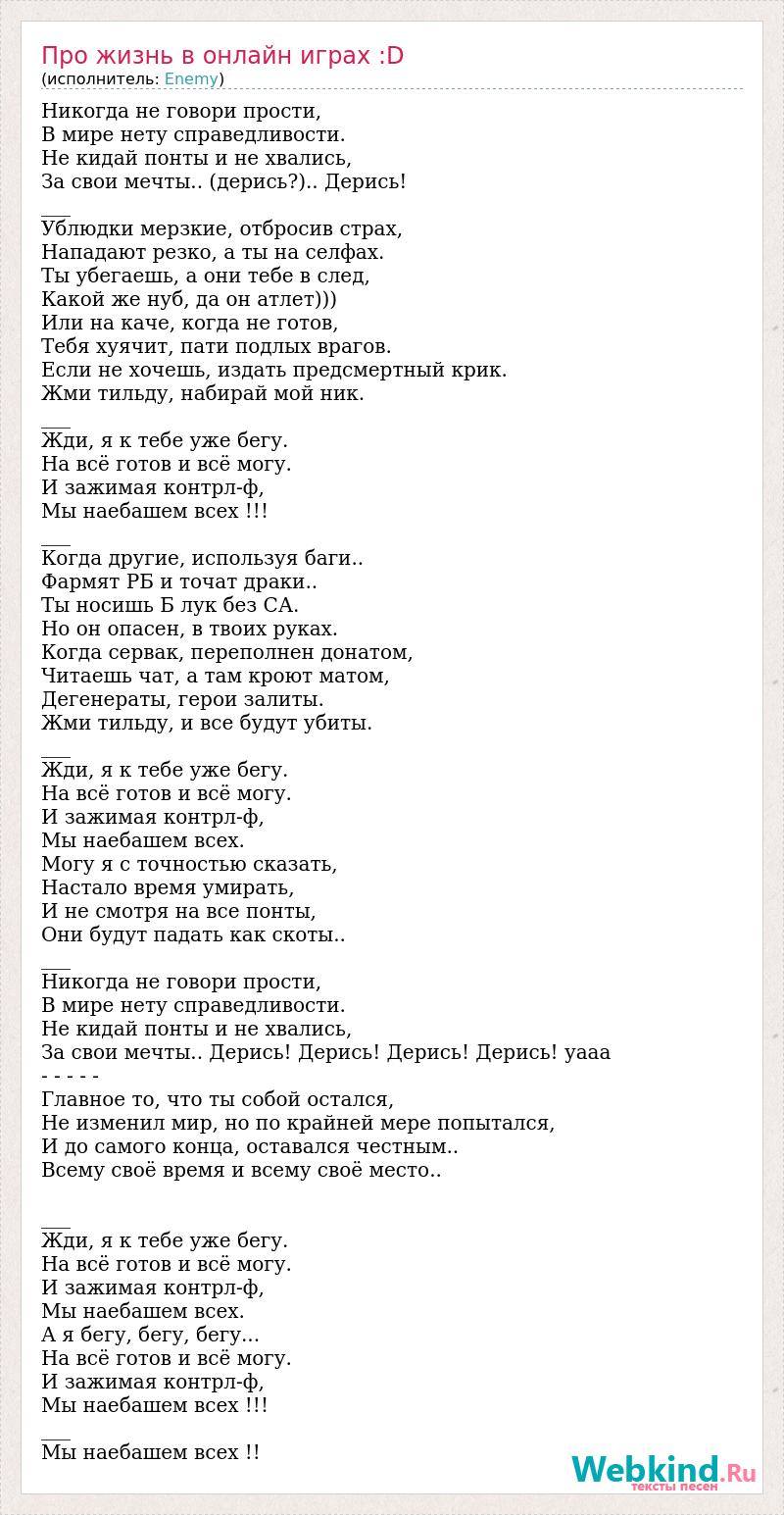 Никогда не говори прости, В мире нету справедливости. Не кидай понты и не хвались, За свои мечты.. (дерись?).. Дерись! ___ Ублюдки мерзкие, отбросив страх, Нападают резко, а ты на селфах. Ты убегаешь, а они тебе в след, Какой же нуб, да он атлет))) Или на каче, когда не готов, Тебя хуячит, пати подлых врагов. Если не хочешь, издать предсмертный крик. Жми тильду, набирай мой ник. ___ Жди, я к тебе уже бегу. На всё готов и всё могу. И зажимая контрл-ф, Мы наебашем всех !!! ___ Когда другие, используя баги.. Фармят РБ и точат драки.. Ты носишь Б лук без СА. Но он опасен, в твоих руках. Когда сервак, переполнен донатом, Читаешь чат, а там кроют матом, Дегенераты, герои залиты. Жми тильду, и все будут убиты. ___ Жди, я к тебе уже бегу. На всё готов и всё могу. И зажимая контрл-ф, Мы наебашем всех. Могу я с точностью сказать, Настало время умирать, И не смотря на все понты, Они будут падать как скоты.. ___ Никогда не говори прости, В мире нету справедливости. Не кидай понты и не хвались, За свои мечты.. Дерись! Дерись! Дерись! Дерись! уааа - - - - - Главное то, что ты собой остался, Не изменил мир, но по крайней мере попытался, И до самого конца, оставался честным.. Всему своё время и всему своё место.. ___ Жди, я к тебе уже бегу. На всё готов и всё могу. И зажимая контрл-ф, Мы наебашем всех. А я бегу, бегу, бегу... На всё готов и всё могу. И зажимая контрл-ф, Мы наебашем всех !!! ___ Мы наебашем всех !!