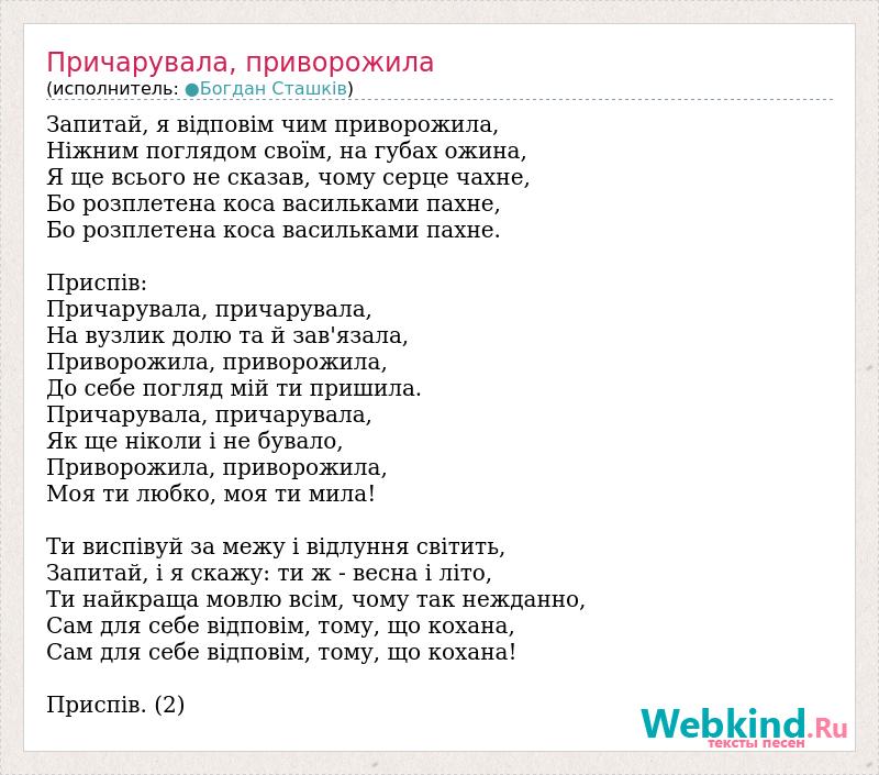 Запитай, я відповім чим приворожила, Ніжним поглядом своїм, на губах ожина, Я ще всього не сказав, чому серце чахне, Бо розплетена коса васильками пахне, Бо розплетена коса васильками пахне. Приспів: Причарувала, причарувала, На вузлик долю та й зав'язала, Приворожила, приворожила, До себе погляд мій ти пришила. Причарувала, причарувала, Як ще ніколи і не бувало, Приворожила, приворожила, Моя ти любко, моя ти мила! Ти виспівуй за межу і відлуння світить, Запитай, і я скажу: ти ж - весна і літо, Ти найкраща мовлю всім, чому так нежданно, Сам для себе відповім, тому, що кохана, Сам для себе відповім, тому, що кохана! Приспів. (2)