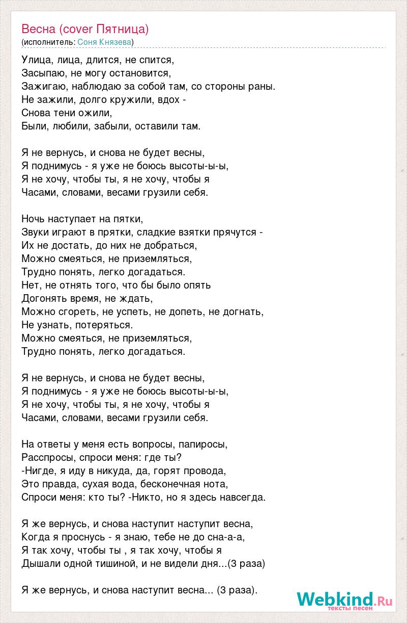 Улица, лица, длится, не спится, Засыпаю, не могу остановится, Зажигаю, наблюдаю за собой там, со стороны раны. Не зажили, долго кружили, вдох - Снова тени ожили, Были, любили, забыли, оставили там. Я не вернусь, и снова не будет весны, Я поднимусь - я уже не боюсь высоты-ы-ы, Я не хочу, чтобы ты, я не хочу, чтобы я Часами, словами, весами грузили себя. Ночь наступает на пятки, Звуки играют в прятки, сладкие взятки прячутся - Их не достать, до них не добраться, Можно смеяться, не приземляться, Трудно понять, легко догадаться. Нет, не отнять того, что бы было опять Догонять время, не ждать, Можно сгореть, не успеть, не допеть, не догнать, Не узнать, потеряться. Можно смеяться, не приземляться, Трудно понять, легко догадаться. Я не вернусь, и снова не будет весны, Я поднимусь - я уже не боюсь высоты-ы-ы, Я не хочу, чтобы ты, я не хочу, чтобы я Часами, словами, весами грузили себя. На ответы у меня есть вопросы, папиросы, Расспросы, спроси меня: где ты? -Нигде, я иду в никуда, да, горят провода, Это правда, сухая вода, бесконечная нота, Спроси меня: кто ты? -Никто, но я здесь навсегда. Я же вернусь, и снова наступит наступит весна, Когда я проснусь - я знаю, тебе не до сна-а-а, Я так хочу, чтобы ты , я так хочу, чтобы я Дышали одной тишиной, и не видели дня...(3 раза) Я же вернусь, и снова наступит весна... (3 раза).