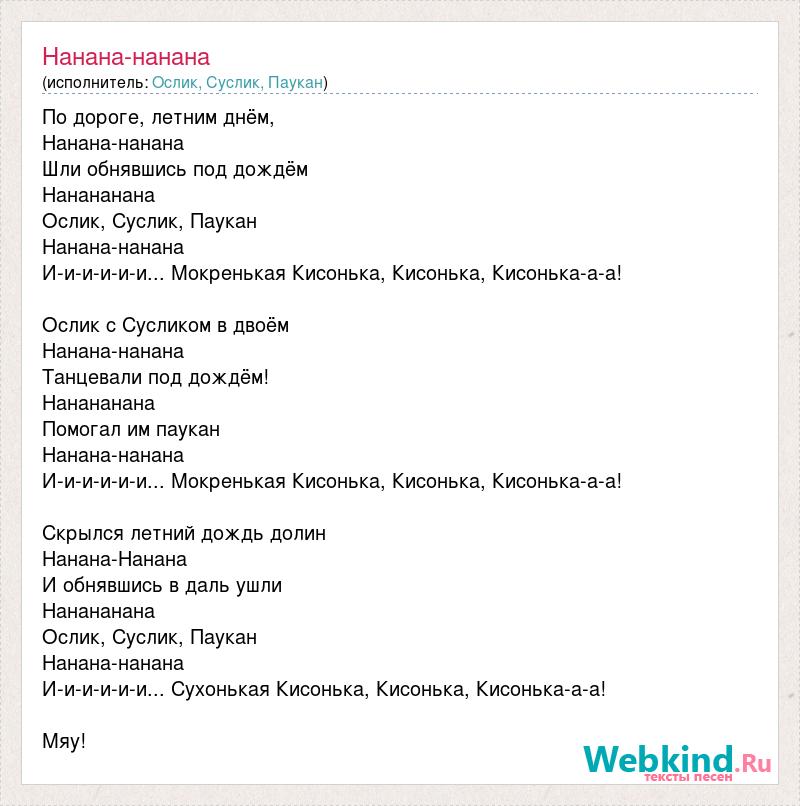 По дороге, летним днём, Нанана-нанана Шли обнявшись под дождём Нанананана Ослик, Суслик, Паукан Нанана-нанана И-и-и-и-и-и... Мокренькая Кисонька, Кисонька, Кисонька-а-а! Ослик с Сусликом в двоём Нанана-нанана Танцевали под дождём! Нанананана Помогал им паукан Нанана-нанана И-и-и-и-и-и... Мокренькая Кисонька, Кисонька, Кисонька-а-а! Скрылся летний дождь долин Нанана-Нанана И обнявшись в даль ушли Нанананана Ослик, Суслик, Паукан Нанана-нанана И-и-и-и-и-и... Сухонькая Кисонька, Кисонька, Кисонька-а-а! Мяу!