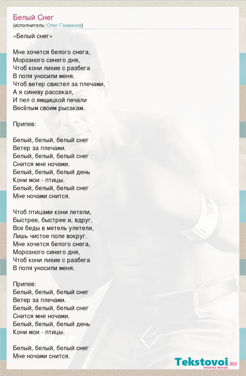 «Белый снег» Мне хочется белого снега, Морозного синего дня, Чтоб кони лихие с разбега В поля уносили меня. Чтоб ветер свистел за плечами, А я синеву рассекал, И пел о ямщицкой печали Весёлым своим рысакам. Припев: Белый, белый, белый снег Ветер за плечами. Белый, белый, белый снег Снится мне ночами. Белый, белый, белый день Кони мои - птицы. Белый, белый, белый снег Мне ночами снится. Чтоб птицами кони летели, Быстрее, быстрее и, вдруг, Все беды в метель улетели, Лишь чистое поле вокруг. Мне хочется белого снега, Морозного синего дня, Чтоб кони лихие с разбега В поля уносили меня. Припев: Белый, белый, белый снег Ветер за плечами. Белый, белый, белый снег Снится мне ночами. Белый, белый, белый день Кони мои - птицы. Белый, белый, белый снег Мне ночами снится.