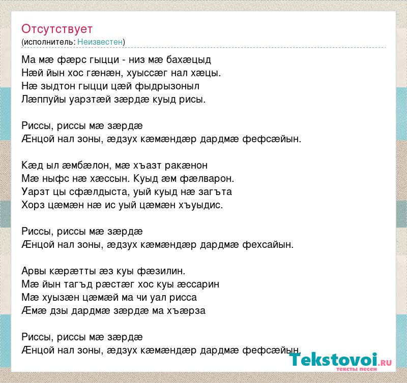 Ма мæ фæрс гыцци - низ мæ бахæцыд Нæй йын хос гæнæн, хуыссæг нал хæцы. Нæ зыдтон гыцци цæй фыдрызоныл Лæппуйы уарзтæй зæрдæ куыд рисы. Риссы, риссы мæ зæрдæ Æнцой нал зоны, æдзух кæмæндæр дардмæ фефсæйын. Кæд ыл æмбæлон, мæ хъазт ракæнон Мæ ныфс нæ хæссын. Куыд æм фæлварон. Уарзт цы сфæлдыста, уый куыд нæ загъта Хорз цæмæн нæ ис уый цæмæн хъуыдис. Риссы, риссы мæ зæрдæ Æнцой нал зоны, æдзух кæмæндæр дардмæ фехсайын. Арвы кæрæтты æз куы фæзилин. Мæ йын тагъд рæстæг хос куы æссарин Мæ хуызæн цæмæй ма чи уал рисса Æмæ дзы дардмæ зæрдæ ма хъæрза Риссы, риссы мæ зæрдæ Æнцой нал зоны, æдзух кæмæндæр дардмæ фефсæйын.