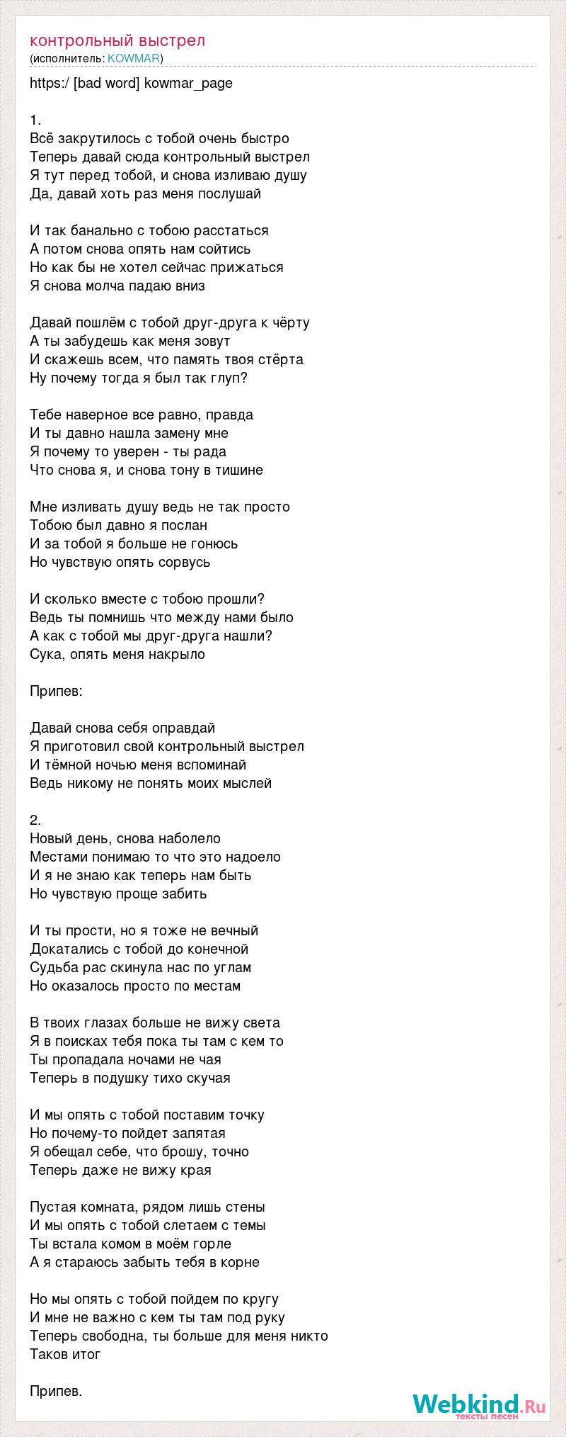 https:/ [bad word] kowmar_page 1. Всё закрутилось с тобой очень быстро Теперь давай сюда контрольный выстрел Я тут перед тобой, и снова изливаю душу Да, давай хоть раз меня послушай И так банально с тобою расстаться А потом снова опять нам сойтись Но как бы не хотел сейчас прижаться Я снова молча падаю вниз Давай пошлём с тобой друг-друга к чёрту А ты забудешь как меня зовут И скажешь всем, что память твоя стёрта Ну почему тогда я был так глуп? Тебе наверное все равно, правда И ты давно нашла замену мне Я почему то уверен - ты рада Что снова я, и снова тону в тишине Мне изливать душу ведь не так просто Тобою был давно я послан И за тобой я больше не гонюсь Но чувствую опять сорвусь И сколько вместе с тобою прошли? Ведь ты помнишь что между нами было А как с тобой мы друг-друга нашли? Сука, опять меня накрыло Припев: Давай снова себя оправдай Я приготовил свой контрольный выстрел И тёмной ночью меня вспоминай Ведь никому не понять моих мыслей 2. Новый день, снова наболело Местами понимаю то что это надоело И я не знаю как теперь нам быть Но чувствую проще забить И ты прости, но я тоже не вечный Докатались с тобой до конечной Судьба рас скинула нас по углам Но оказалось просто по местам В твоих глазах больше не вижу света Я в поисках тебя пока ты там с кем то Ты пропадала ночами не чая Теперь в подушку тихо скучая И мы опять с тобой поставим точку Но почему-то пойдет запятая Я обещал себе, что брошу, точно Теперь даже не вижу края Пустая комната, рядом лишь стены И мы опять с тобой слетаем с темы Ты встала комом в моём горле А я стараюсь забыть тебя в корне Но мы опять с тобой пойдем по кругу И мне не важно с кем ты там под руку Теперь свободна, ты больше для меня никто Таков итог Припев.