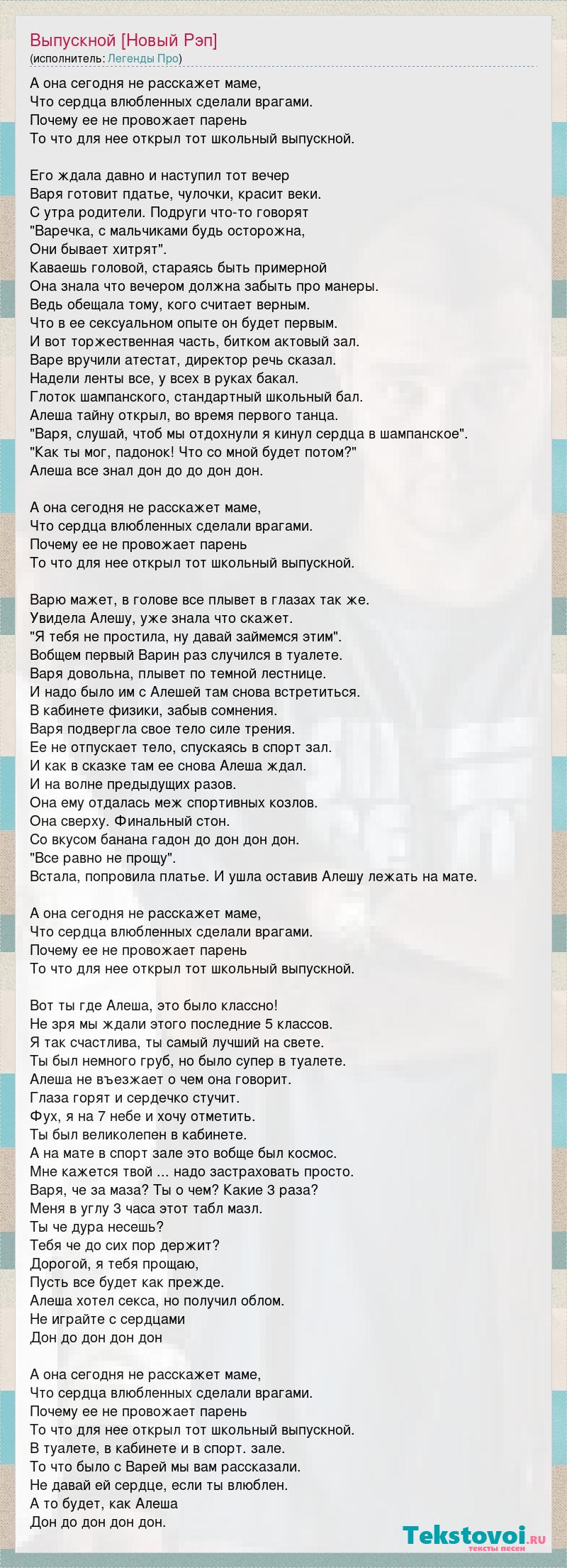 А она сегодня не расскажет маме, Что сердца влюбленных сделали врагами. Почему ее не провожает парень То что для нее открыл тот школьный выпускной. Его ждала давно и наступил тот вечер Варя готовит пдатье, чулочки, красит веки. С утра родители. Подруги что-то говорят "Варечка, с мальчиками будь осторожна, Они бывает хитрят". Каваешь головой, стараясь быть примерной Она знала что вечером должна забыть про манеры. Ведь обещала тому, кого считает верным. Что в ее сексуальном опыте он будет первым. И вот торжественная часть, битком актовый зал. Варе вручили атестат, директор речь сказал. Надели ленты все, у всех в руках бакал. Глоток шампанского, стандартный школьный бал. Алеша тайну открыл, во время первого танца. "Варя, слушай, чтоб мы отдохнули я кинул сердца в шампанское". "Как ты мог, падонок! Что со мной будет потом?" Алеша все знал дон до до дон дон. А она сегодня не расскажет маме, Что сердца влюбленных сделали врагами. Почему ее не провожает парень То что для нее открыл тот школьный выпускной. Варю мажет, в голове все плывет в глазах так же. Увидела Алешу, уже знала что скажет. "Я тебя не простила, ну давай займемся этим". Вобщем первый Варин раз случился в туалете. Варя довольна, плывет по темной лестнице. И надо было им с Алешей там снова встретиться. В кабинете физики, забыв сомнения. Варя подвергла свое тело силе трения. Ее не отпускает тело, спускаясь в спорт зал. И как в сказке там ее снова Алеша ждал. И на волне предыдущих разов. Она ему отдалась меж спортивных козлов. Она сверху. Финальный стон. Со вкусом банана гадон до дон дон дон. "Все равно не прощу". Встала, попровила платье. И ушла оставив Алешу лежать на мате. А она сегодня не расскажет маме, Что сердца влюбленных сделали врагами. Почему ее не провожает парень То что для нее открыл тот школьный выпускной. Вот ты где Алеша, это было классно! Не зря мы ждали этого последние 5 классов. Я так счастлива, ты самый лучший на свете. Ты был немного груб, но было супер в туалете. Алеша не въезжает о чем она говорит. Глаза горят и сердечко стучит. Фух, я на 7 небе и хочу отметить. Ты был великолепен в кабинете. А на мате в спорт зале это вобще был космос. Мне кажется твой ... надо застраховать просто. Варя, че за маза? Ты о чем? Какие 3 раза? Меня в углу 3 часа этот табл мазл. Ты че дура несешь? Тебя че до сих пор держит? Дорогой, я тебя прощаю, Пусть все будет как прежде. Алеша хотел секса, но получил облом. Не играйте с сердцами Дон до дон дон дон А она сегодня не расскажет маме, Что сердца влюбленных сделали врагами. Почему ее не провожает парень То что для нее открыл тот школьный выпускной. В туалете, в кабинете и в спорт. зале. То что было с Варей мы вам рассказали. Не давай ей сердце, если ты влюблен. А то будет, как Алеша Дон до дон дон дон.