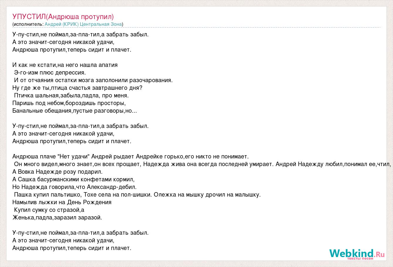 У-пу-стил,не поймал,за-пла-тил,а забрать забыл. А это значит-сегодня никакой удачи, Андрюша протупил,теперь сидит и плачет. И как не кстати,на него нашла апатия Э-го-изм плюс депрессия. И от отчаяния остатки мозга заполонили разочарования. Ну где же ты,птица счастья завтрашнего дня? Птичка шальная,забыла,падла, про меня. Паришь под небом,бороздишь просторы, Банальные обещания,пустые разговоры,но... У-пу-стил,не поймал,за-пла-тил,а забрать забыл. А это значит-сегодня никакой удачи, Андрюша протупил,теперь сидит и плачет. Андрюша плаче "Нет удачи" Андрей рыдает Андрейке горько,его никто не понимает. Он много видел,много знает,он всех прощает, Надежда жива она всегда последней умирает. Андрей Надежду любил,понимал ее,чтил, А Вовка Надежде розу подарил. А Сашка басурманскими конфетами кормил, Но Надежда говорила,что Александр-дебил. Пашка купил пальтишко, Тохе села на пол-шишки. Олежка на мышку дрочил на малышку. Намылив лыжки на День Рождения Купил сумку со стразой,а Женька,падла,заразил заразой. У-пу-стил,не поймал,за-пла-тил,а забрать забыл. А это значит-сегодня никакой удачи, Андрюша протупил,теперь сидит и плачет.