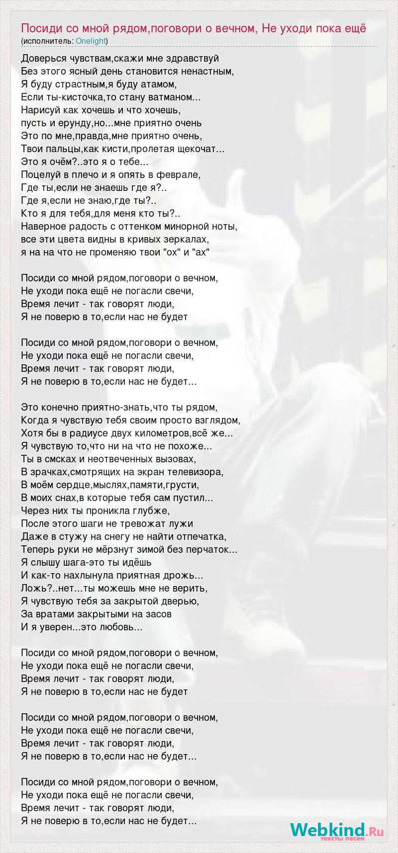 Доверься чувствам,скажи мне здравствуй Без этого ясный день становится ненастным, Я буду страстным,я буду атамом, Если ты-кисточка,то стану ватманом... Нарисуй как хочешь и что хочешь, пусть и ерунду,но...мне приятно очень Это по мне,правда,мне приятно очень, Твои пальцы,как кисти,пролетая щекочат... Это я очём?..это я о тебе... Поцелуй в плечо и я опять в феврале, Где ты,если не знаешь где я?.. Где я,если не знаю,где ты?.. Кто я для тебя,для меня кто ты?.. Наверное радость с оттенком минорной ноты, все эти цвета видны в кривых зеркалах, я на на что не променяю твои "ох" и "ах" Посиди со мной рядом,поговори о вечном, Не уходи пока ещё не погасли свечи, Время лечит - так говорят люди, Я не поверю в то,если нас не будет Посиди со мной рядом,поговори о вечном, Не уходи пока ещё не погасли свечи, Время лечит - так говорят люди, Я не поверю в то,если нас не будет... Это конечно приятно-знать,что ты рядом, Когда я чувствую тебя своим просто взглядом, Хотя бы в радиусе двух километров,всё же... Я чувствую то,что ни на что не похоже... Ты в смсках и неотвеченных вызовах, В зрачках,смотрящих на экран телевизора, В моём сердце,мыслях,памяти,грусти, В моих снах,в которые тебя сам пустил... Через них ты проникла глубже, После этого шаги не тревожат лужи Даже в стужу на снегу не найти отпечатка, Теперь руки не мёрзнут зимой без перчаток... Я слышу шага-это ты идёшь И как-то нахлынула приятная дрожь... Ложь?..нет...ты можешь мне не верить, Я чувствую тебя за закрытой дверью, За вратами закрытыми на засов И я уверен...это любовь... Посиди со мной рядом,поговори о вечном, Не уходи пока ещё не погасли свечи, Время лечит - так говорят люди, Я не поверю в то,если нас не будет Посиди со мной рядом,поговори о вечном, Не уходи пока ещё не погасли свечи, Время лечит - так говорят люди, Я не поверю в то,если нас не будет... Посиди со мной рядом,поговори о вечном, Не уходи пока ещё не погасли свечи, Время лечит - так говорят люди, Я не поверю в то,если нас не будет...