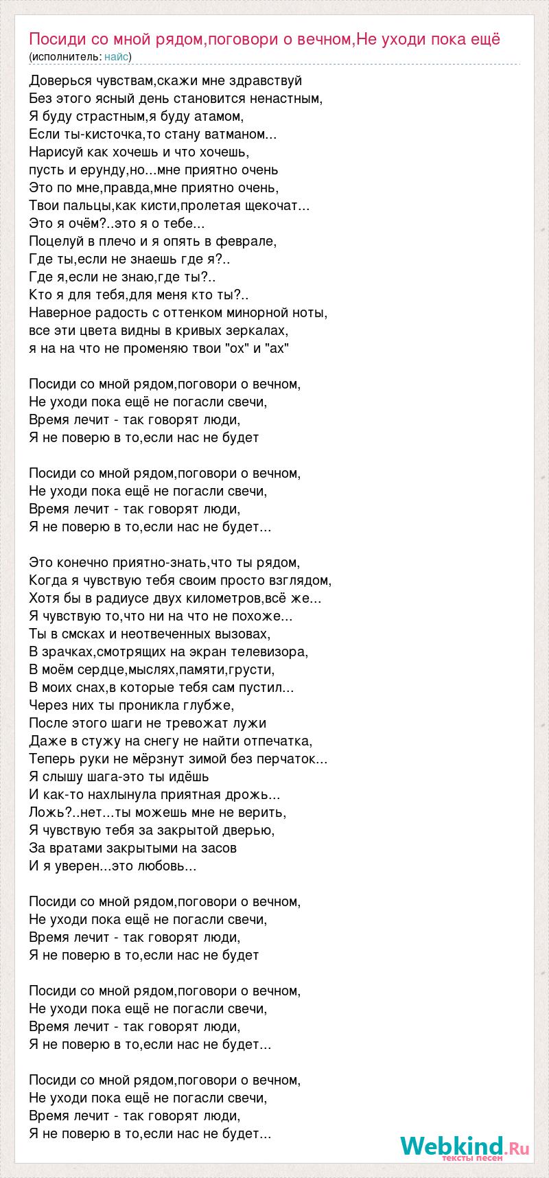 Доверься чувствам,скажи мне здравствуй Без этого ясный день становится ненастным, Я буду страстным,я буду атамом, Если ты-кисточка,то стану ватманом... Нарисуй как хочешь и что хочешь, пусть и ерунду,но...мне приятно очень Это по мне,правда,мне приятно очень, Твои пальцы,как кисти,пролетая щекочат... Это я очём?..это я о тебе... Поцелуй в плечо и я опять в феврале, Где ты,если не знаешь где я?.. Где я,если не знаю,где ты?.. Кто я для тебя,для меня кто ты?.. Наверное радость с оттенком минорной ноты, все эти цвета видны в кривых зеркалах, я на на что не променяю твои "ох" и "ах" Посиди со мной рядом,поговори о вечном, Не уходи пока ещё не погасли свечи, Время лечит - так говорят люди, Я не поверю в то,если нас не будет Посиди со мной рядом,поговори о вечном, Не уходи пока ещё не погасли свечи, Время лечит - так говорят люди, Я не поверю в то,если нас не будет... Это конечно приятно-знать,что ты рядом, Когда я чувствую тебя своим просто взглядом, Хотя бы в радиусе двух километров,всё же... Я чувствую то,что ни на что не похоже... Ты в смсках и неотвеченных вызовах, В зрачках,смотрящих на экран телевизора, В моём сердце,мыслях,памяти,грусти, В моих снах,в которые тебя сам пустил... Через них ты проникла глубже, После этого шаги не тревожат лужи Даже в стужу на снегу не найти отпечатка, Теперь руки не мёрзнут зимой без перчаток... Я слышу шага-это ты идёшь И как-то нахлынула приятная дрожь... Ложь?..нет...ты можешь мне не верить, Я чувствую тебя за закрытой дверью, За вратами закрытыми на засов И я уверен...это любовь... Посиди со мной рядом,поговори о вечном, Не уходи пока ещё не погасли свечи, Время лечит - так говорят люди, Я не поверю в то,если нас не будет Посиди со мной рядом,поговори о вечном, Не уходи пока ещё не погасли свечи, Время лечит - так говорят люди, Я не поверю в то,если нас не будет... Посиди со мной рядом,поговори о вечном, Не уходи пока ещё не погасли свечи, Время лечит - так говорят люди, Я не поверю в то,если нас не будет...