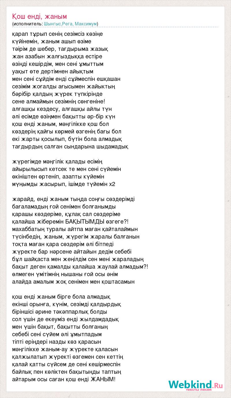 қарап тұрып сенің сезімсіз көзіңе күйінемін, жаным ашып өзіме тәірім де шебер, тағдырыма жазық жан азабын жалғыздыққа естіре өзіңді кешірдім, мен сені ұмыттым уақыт өте дертімнен айықтым мен сені сұйдім енді сұймеспін ешқашан сезімім жоғалды ағысымен жайыктың бәрібір қалдың жүрек түпкірінде сене алмаймын сезімнің сөнгеніне! алғашқы кездесу, алғашқы айлы түн әлі есімде өзіңмен бақытты әр-бір күн қош енді жаным, мәңгілікке қош бол көздерің қайғы көрмей өзгенің бағы бол екі жарты қосылып, бүтін бола алмадық тағдырдың салған сындарына шыдамадық жүрегімде мәңгілік қалады есімің айырылысып кетсек те мен сені сүйемін өкініштен өртеніп, азапты күйемін мүңымды жасырып, ішімде түйемін х2 жарайд, енді жаным тыңда соңғы сөздерімді бағаламадың ғой сенімен болғанымды қарашы көздеріме, құлақ сал сөздеріме қалайша жіберемін БАҚЫТЫМДЫ өзгеге?! махаббатың туралы айтпа маған қайталаймын түсінбедің, жаным, жүрегім жаралы балғанын тоқта маған қара сөздерім әлі бітпеді жүректе бар нәрсене айтайын дедім себебі бұл шайқаста мен жеңілдім сен мені жараладың бақыт деген қамалды қалайша жаулай алмадым?! өлмеген үмітімнің нышаны ғой осы әнім алайда амалым жоқ сенімен мен қоштасамын қош енді жаным бірге бола алмадық екінші орынға, күнім, сезімді қалдырдық біріншісі әрине тәкәппарлық болды сол үшін де екеуміз енді жылдамдадық мен үшін бақыт, бақытты болғаның себебі сені сүйем әлі ұмытпадым тіпті еріңдері назды көз қарасын мәңгілікке жаным-ау жүректе қаласын қалжылатып жүректі өзгемен сен кеттің қалай қатты сүйсем де сені кешірмеспін байлық пен көліктен бақытыңды таптың айтарым осы саған қош енді ЖАНЫМ!