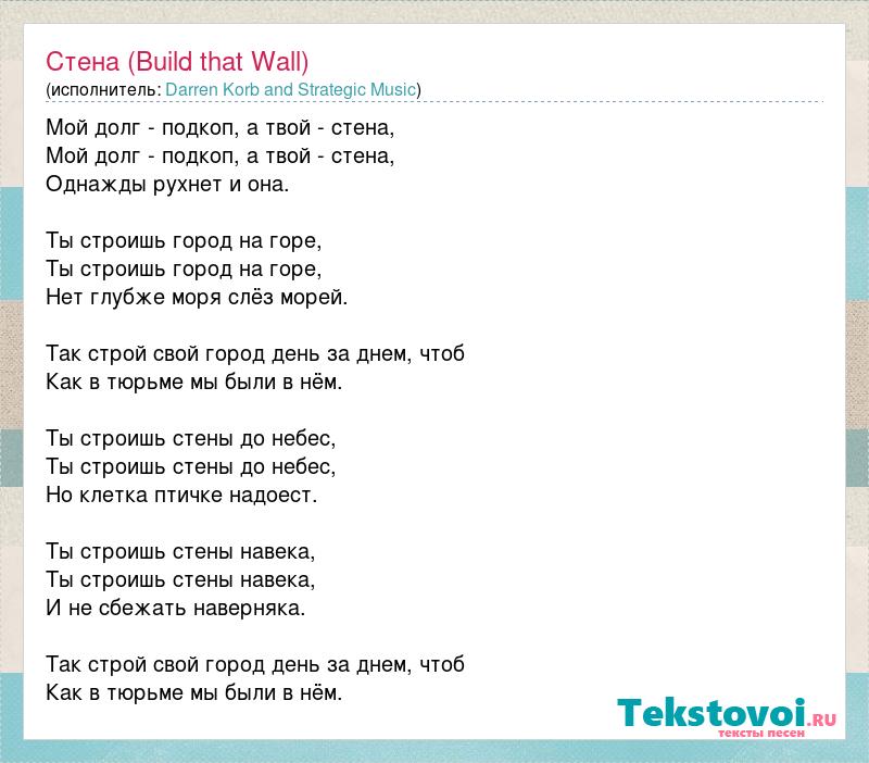 Мой долг - подкоп, а твой - стена, Мой долг - подкоп, а твой - стена, Однажды рухнет и она. Ты строишь город на горе, Ты строишь город на горе, Нет глубже моря слёз морей. Так строй свой город день за днем, чтоб Как в тюрьме мы были в нём. Ты строишь стены до небес, Ты строишь стены до небес, Но клетка птичке надоест. Ты строишь стены навека, Ты строишь стены навека, И не сбежать наверняка. Так строй свой город день за днем, чтоб Как в тюрьме мы были в нём.