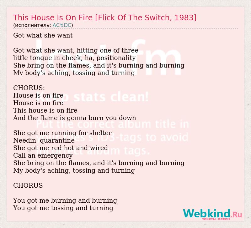 Got what she want Got what she want, hitting one of three little tongue in cheek, ha, positionality She bring on the flames, and it's burning and burning My body's aching, tossing and turning CHORUS: House is on fire House is on fire This house is on fire And the flame is gonna burn you down She got me running for shelter Needin' quarantine She got me red hot and wired Call an emergency She bring on the flames, and it's burning and burning My body's aching, tossing and turning CHORUS You got me burning and burning You got me tossing and turning