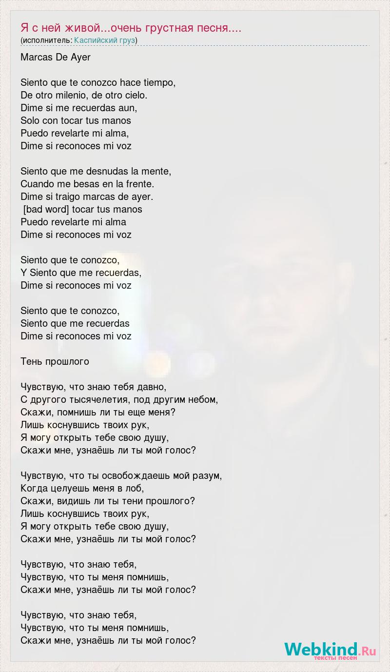 Marcas De Ayer Siento que te conozco hace tiempo, De otro milenio, de otro cielo. Dime si me recuerdas aun, Solo con tocar tus manos Puedo revelarte mi alma, Dime si reconoces mi voz Siento que me desnudas la mente, Cuando me besas en la frente. Dime si traigo marcas de ayer. [bad word] tocar tus manos Puedo revelarte mi alma Dime si reconoces mi voz Siento que te conozco, Y Siento que me recuerdas, Dime si reconoces mi voz Siento que te conozco, Siento que me recuerdas Dime si reconoces mi voz Тень прошлого Чувствую, что знаю тебя давно, С другого тысячелетия, под другим небом, Скажи, помнишь ли ты еще меня? Лишь коснувшись твоих рук, Я могу открыть тебе свою душу, Скажи мне, узнаёшь ли ты мой голос? Чувствую, что ты освобождаешь мой разум, Когда целуешь меня в лоб, Скажи, видишь ли ты тени прошлого? Лишь коснувшись твоих рук, Я могу открыть тебе свою душу, Скажи мне, узнаёшь ли ты мой голос? Чувствую, что знаю тебя, Чувствую, что ты меня помнишь, Скажи мне, узнаёшь ли ты мой голос? Чувствую, что знаю тебя, Чувствую, что ты меня помнишь, Скажи мне, узнаёшь ли ты мой голос?