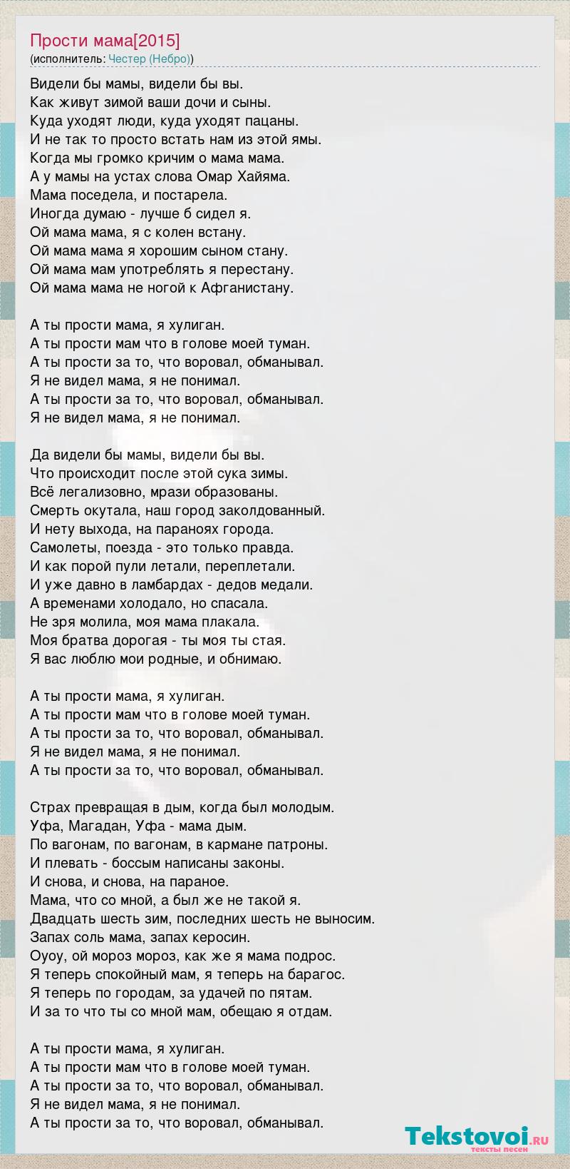 Видели бы мамы, видели бы вы. Как живут зимой ваши дочи и сыны. Куда уходят люди, куда уходят пацаны. И не так то просто встать нам из этой ямы. Когда мы громко кричим о мама мама. А у мамы на устах слова Омар Хайяма. Мама поседела, и постарела. Иногда думаю - лучше б сидел я. Ой мама мама, я с колен встану. Ой мама мама я хорошим сыном стану. Ой мама мам употреблять я перестану. Ой мама мама не ногой к Афганистану. А ты прости мама, я хулиган. А ты прости мам что в голове моей туман. А ты прости за то, что воровал, обманывал. Я не видел мама, я не понимал. А ты прости за то, что воровал, обманывал. Я не видел мама, я не понимал. Да видели бы мамы, видели бы вы. Что происходит после этой сука зимы. Всё легализовно, мрази образованы. Смерть окутала, наш город заколдованный. И нету выхода, на параноях города. Самолеты, поезда - это только правда. И как порой пули летали, переплетали. И уже давно в ламбардах - дедов медали. А временами холодало, но спасала. Не зря молила, моя мама плакала. Моя братва дорогая - ты моя ты стая. Я вас люблю мои родные, и обнимаю. А ты прости мама, я хулиган. А ты прости мам что в голове моей туман. А ты прости за то, что воровал, обманывал. Я не видел мама, я не понимал. А ты прости за то, что воровал, обманывал. Страх превращая в дым, когда был молодым. Уфа, Магадан, Уфа - мама дым. По вагонам, по вагонам, в кармане патроны. И плевать - боссым написаны законы. И снова, и снова, на параное. Мама, что со мной, а был же не такой я. Двадцать шесть зим, последних шесть не выносим. Запах соль мама, запах керосин. Оуоу, ой мороз мороз, как же я мама подрос. Я теперь спокойный мам, я теперь на барагос. Я теперь по городам, за удачей по пятам. И за то что ты со мной мам, обещаю я отдам. А ты прости мама, я хулиган. А ты прости мам что в голове моей туман. А ты прости за то, что воровал, обманывал. Я не видел мама, я не понимал. А ты прости за то, что воровал, обманывал.