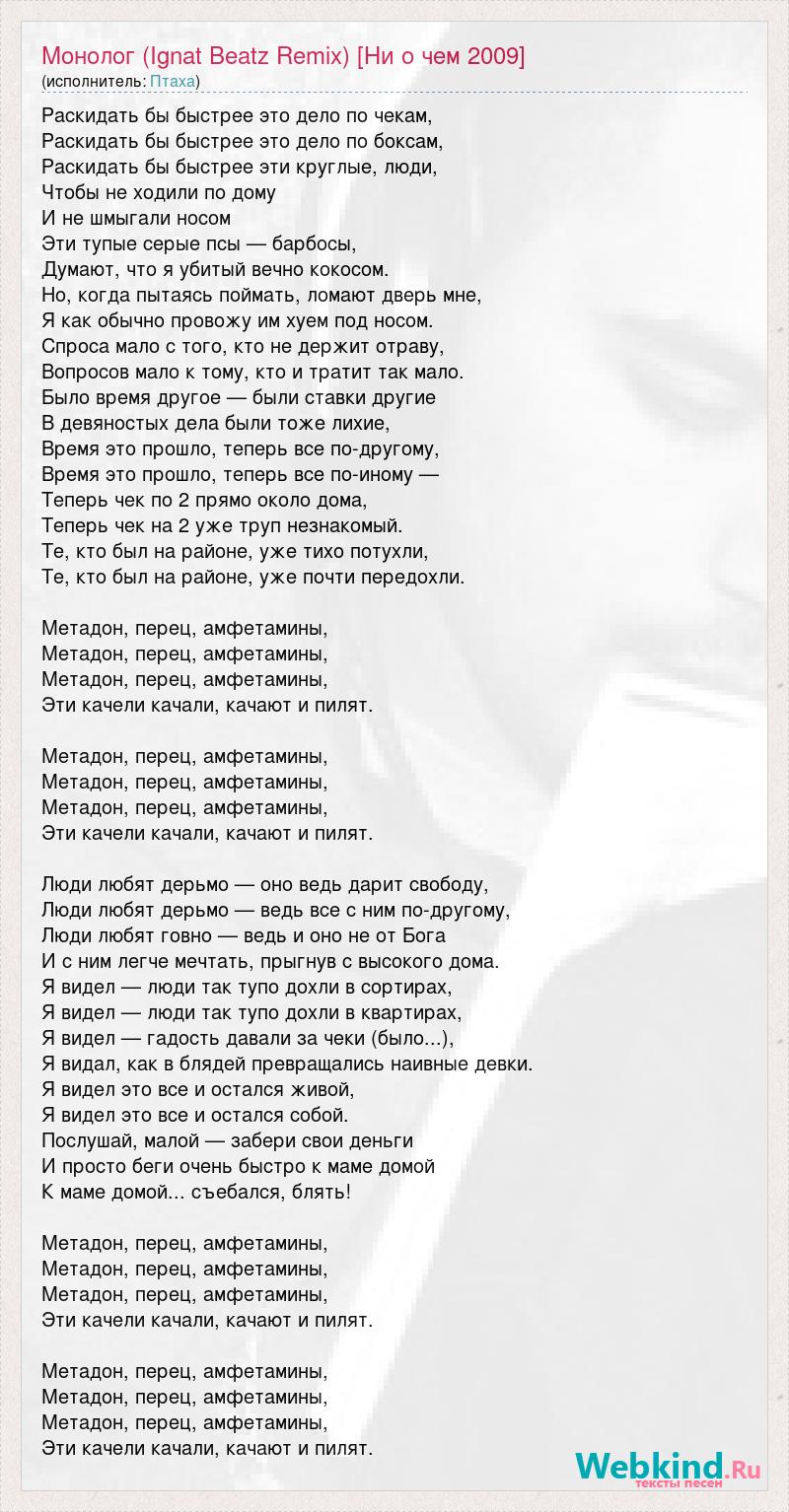 Раскидать бы быстрее это дело по чекам, Раскидать бы быстрее это дело по боксам, Раскидать бы быстрее эти круглые, люди, Чтобы не ходили по дому И не шмыгали носом Эти тупые серые псы — барбосы, Думают, что я убитый вечно кокосом. Но, когда пытаясь поймать, ломают дверь мне, Я как обычно провожу им хуем под носом. Спроса мало с того, кто не держит отраву, Вопросов мало к тому, кто и тратит так мало. Было время другое — были ставки другие В девяностых дела были тоже лихие, Время это прошло, теперь все по-другому, Время это прошло, теперь все по-иному — Теперь чек по 2 прямо около дома, Теперь чек на 2 уже труп незнакомый. Те, кто был на районе, уже тихо потухли, Те, кто был на районе, уже почти передохли. Метадон, перец, амфетамины, Метадон, перец, амфетамины, Метадон, перец, амфетамины, Эти качели качали, качают и пилят. Метадон, перец, амфетамины, Метадон, перец, амфетамины, Метадон, перец, амфетамины, Эти качели качали, качают и пилят. Люди любят дерьмо — оно ведь дарит свободу, Люди любят дерьмо — ведь все с ним по-другому, Люди любят говно — ведь и оно не от Бога И с ним легче мечтать, прыгнув с высокого дома. Я видел — люди так тупо дохли в сортирах, Я видел — люди так тупо дохли в квартирах, Я видел — гадость давали за чеки (было...), Я видал, как в блядей превращались наивные девки. Я видел это все и остался живой, Я видел это все и остался собой. Послушай, малой — забери свои деньги И просто беги очень быстро к маме домой К маме домой... съебался, блять! Метадон, перец, амфетамины, Метадон, перец, амфетамины, Метадон, перец, амфетамины, Эти качели качали, качают и пилят. Метадон, перец, амфетамины, Метадон, перец, амфетамины, Метадон, перец, амфетамины, Эти качели качали, качают и пилят.